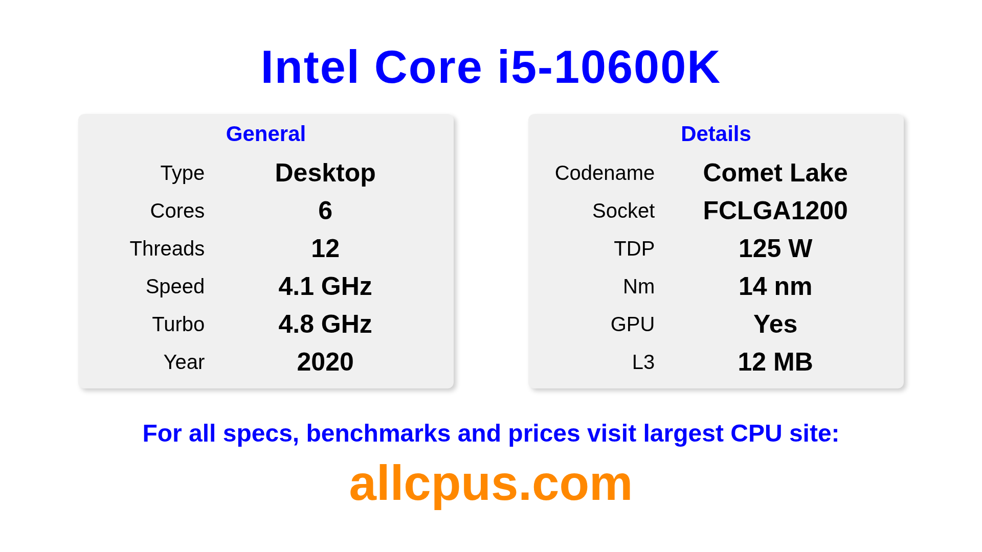 The Intel Core i5-10600K is a Intel desktop processor from the Intel Core lineup, built on the Comet Lake architecture and released in 2020. This CPU features 6 cores, a base clock of 4100 MHz, maximum turbo frequency of 4800 MHz and 12 MB of L3 cache. Manufactured using 14 nm process technology. The Intel Core i5-10600K is designed for the LGA1200 socket.It supports overclocking. It includes integrated Intel® UHD Graphics 630 graphics.