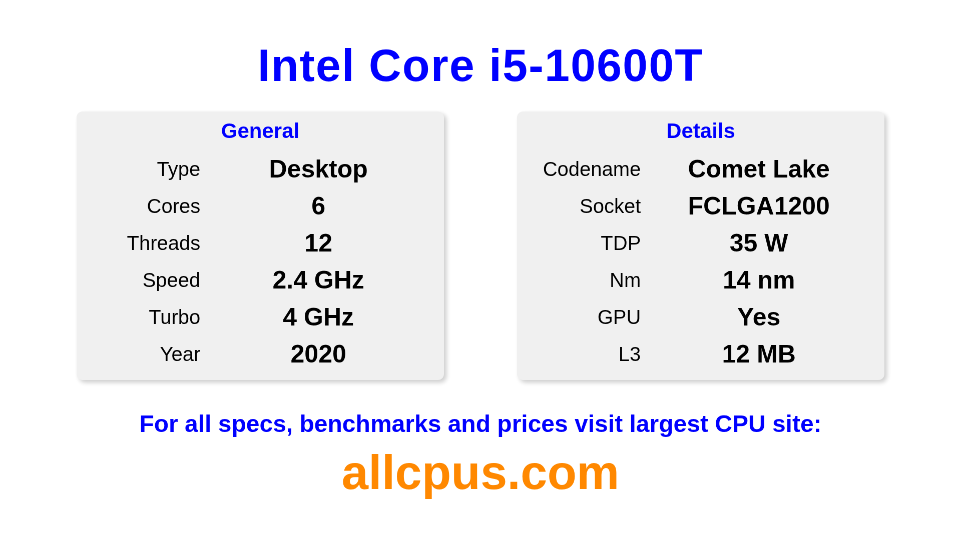 The Intel Core i5-10600T is a Intel desktop processor from the Intel Core lineup, built on the Comet Lake architecture and released in 2020. This CPU features 6 cores, a base clock of 2400 MHz, maximum turbo frequency of 4000 MHz and 12 MB of L3 cache. Manufactured using 14 nm process technology. The Intel Core i5-10600T is designed for the LGA1200 socket. It includes integrated Intel® UHD Graphics 630 graphics.