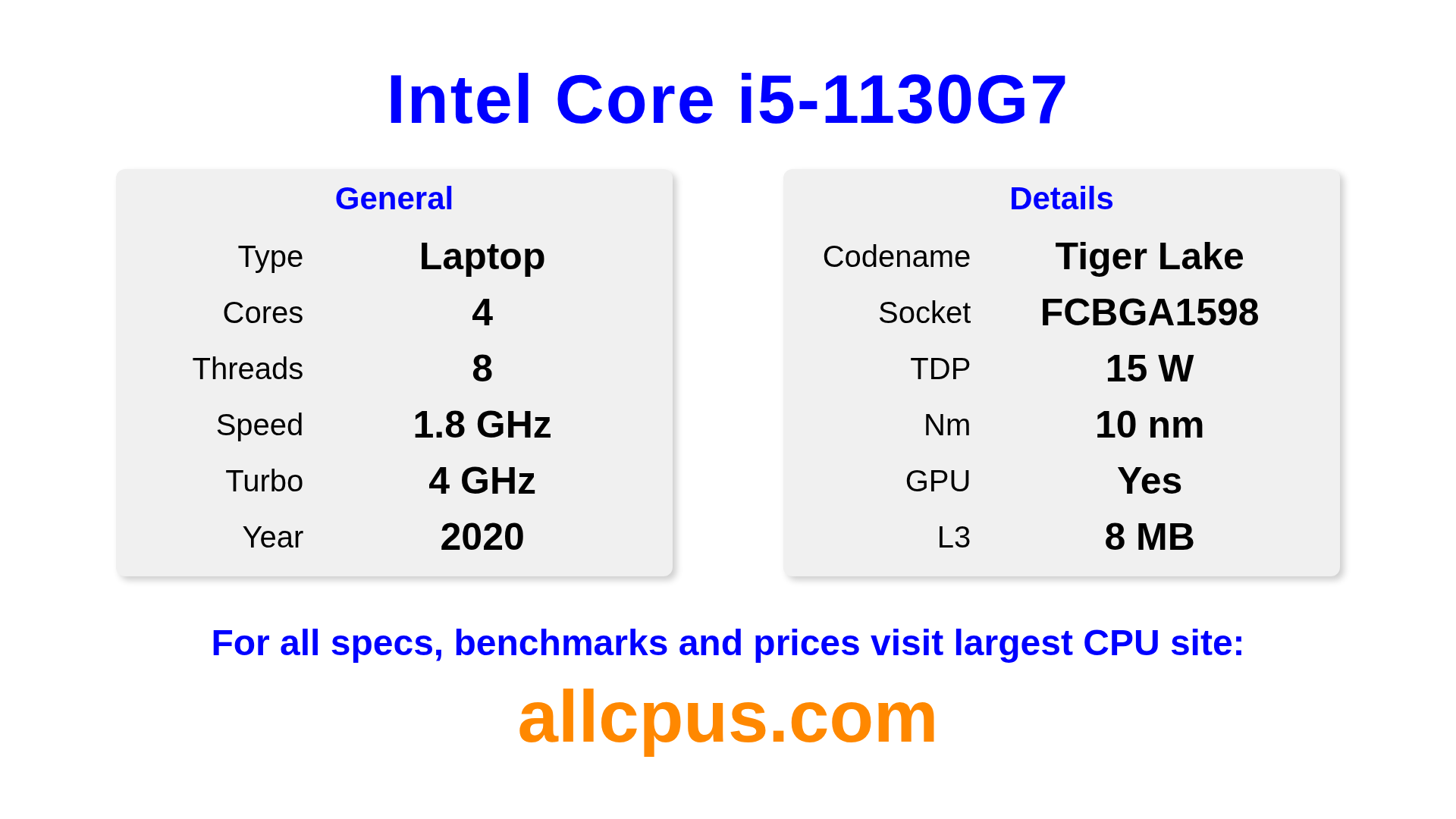 The Intel Core i5-1130G7 is a Intel laptop processor from the Intel Core lineup, built on the Tiger Lake architecture and released in 2020. This CPU features 4 cores, a base clock of 1800 MHz, maximum turbo frequency of 4000 MHz and 8 MB of L3 cache. Manufactured using 10 nm process technology. The Intel Core i5-1130G7 is designed for the BGA1598 socket. It includes integrated Intel® Iris® Xe Graphics graphics.