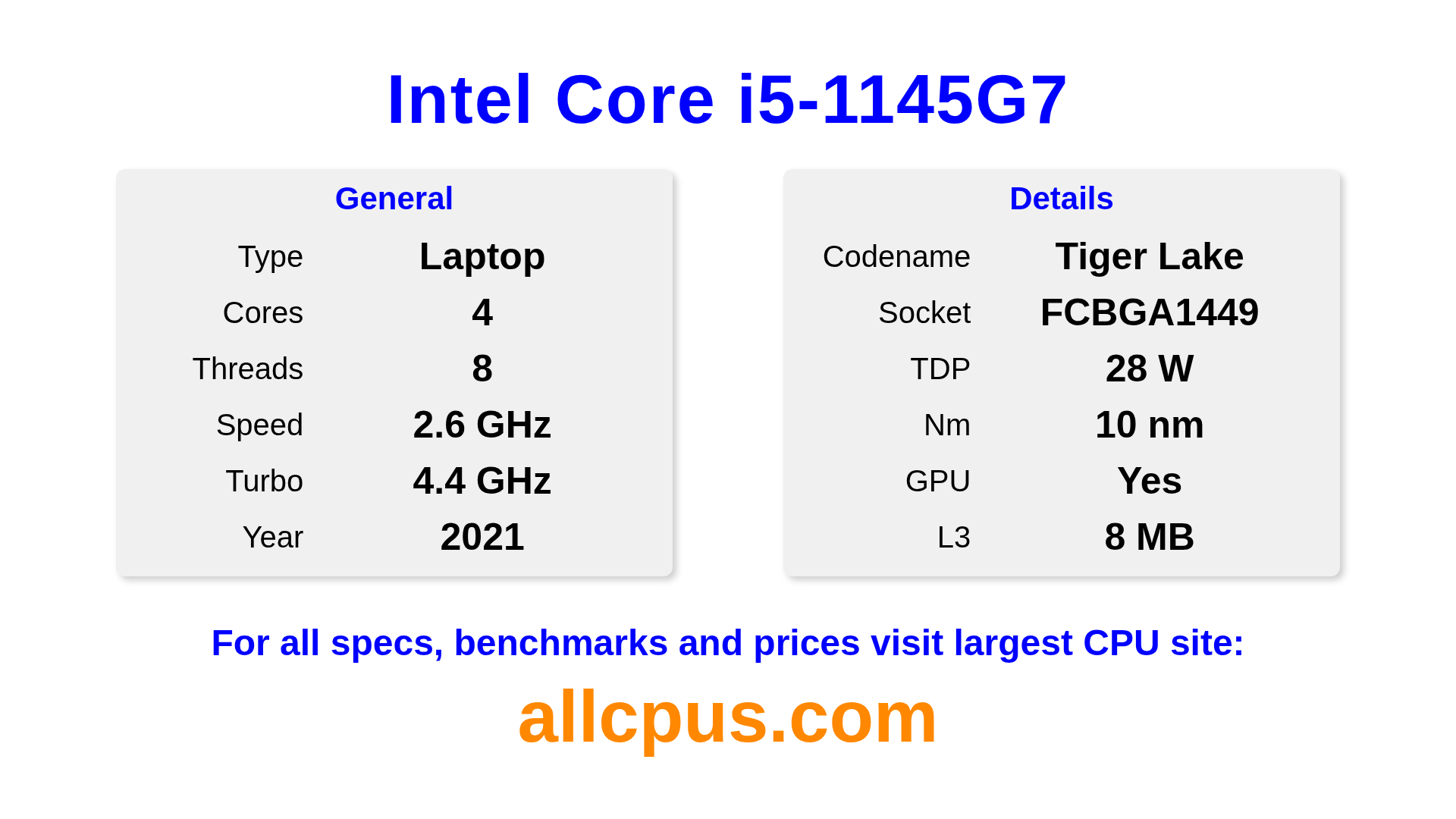 The Intel Core i5-1145G7 is a Intel laptop processor from the Intel Core lineup, built on the Tiger Lake architecture and released in 2021. This CPU features 4 cores, a base clock of 2600 MHz, maximum turbo frequency of 4400 MHz and 8 MB of L3 cache. Manufactured using 10 nm process technology. The Intel Core i5-1145G7 is designed for the BGA1449 socket. It includes integrated Intel® Iris® Xe Graphics graphics.