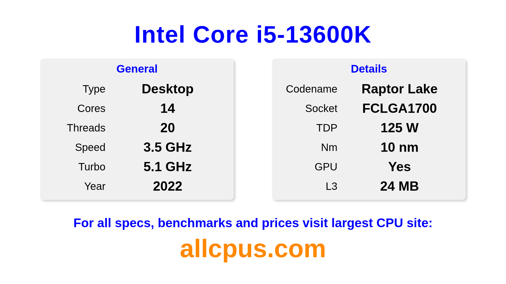 The Intel Core i5-13600K is a Intel desktop processor from the Intel Core lineup, built on the Raptor Lake architecture and released in 2022. This CPU features 14 cores, a base clock of 3500 MHz, maximum turbo frequency of 5100 MHz and 24 MB of L3 cache. Manufactured using 10 nm process technology. The Intel Core i5-13600K is designed for the LGA1700 socket.It supports overclocking. It includes integrated Intel® UHD Graphics 770 graphics.