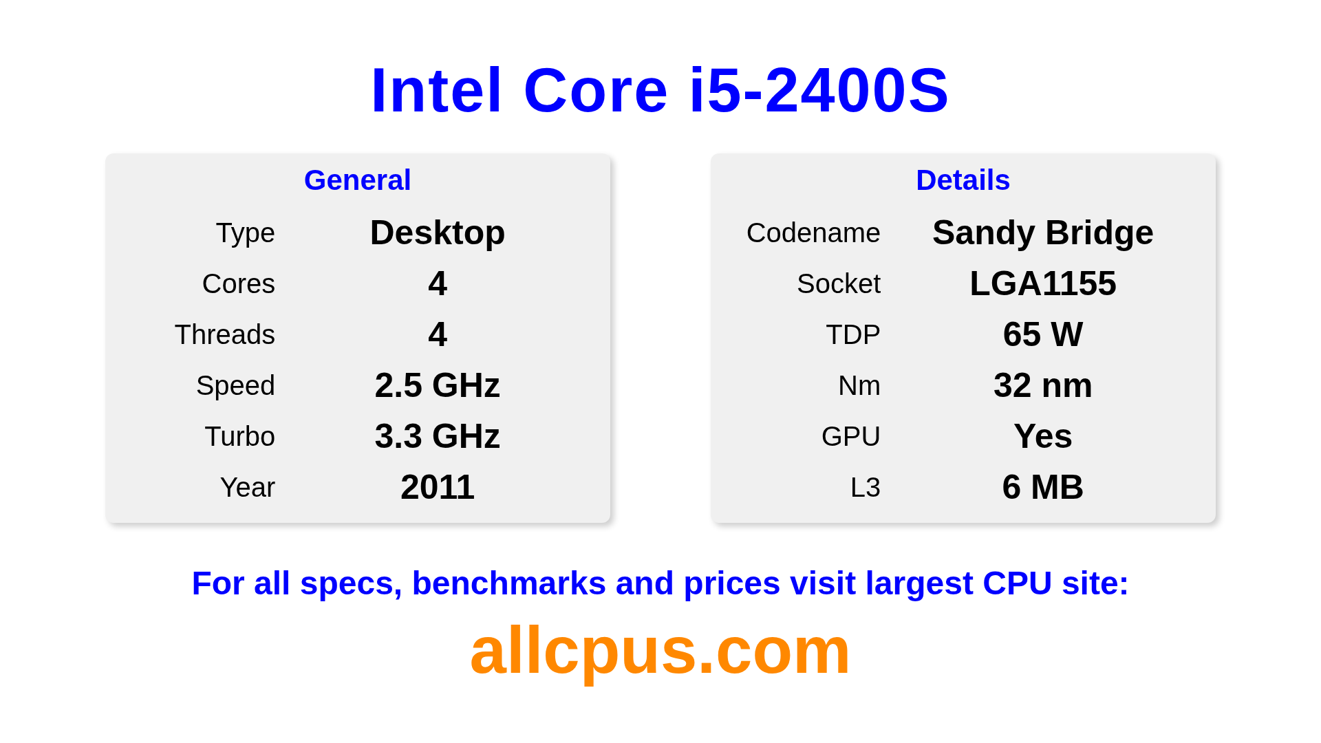 The Intel Core i5-2400S is a Intel desktop processor from the Intel Core lineup, built on the Sandy Bridge architecture and released in 2011. This CPU features 4 cores, a base clock of 2500 MHz, maximum turbo frequency of 3300 MHz and 6 MB of L3 cache. Manufactured using 32 nm process technology. The Intel Core i5-2400S is designed for the LGA1155 socket. It includes integrated Intel® HD Graphics 2000 graphics.