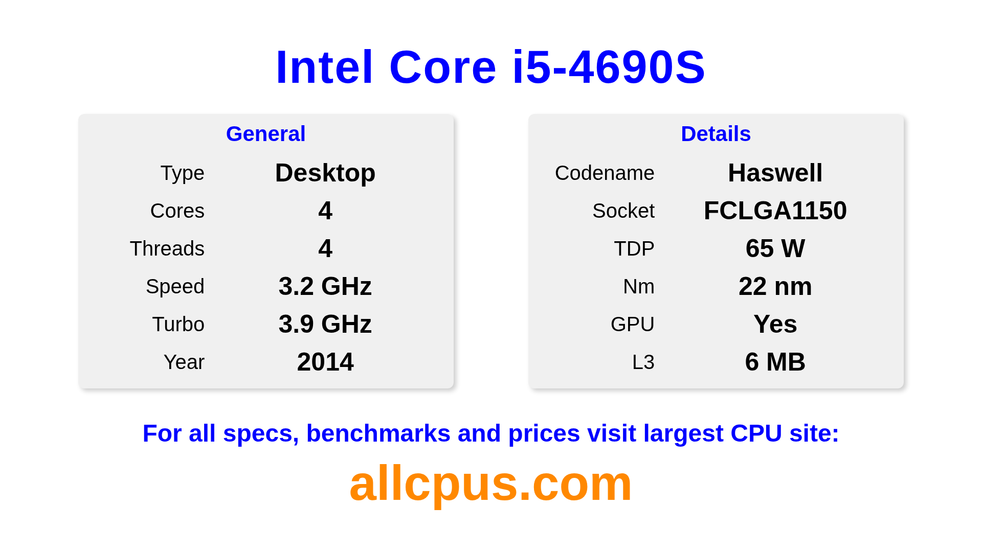 The Intel Core i5-4690S is a Intel desktop processor from the Intel Core lineup, built on the Haswell architecture and released in 2014. This CPU features 4 cores, a base clock of 3200 MHz, maximum turbo frequency of 3900 MHz and 6 MB of L3 cache. Manufactured using 22 nm process technology. The Intel Core i5-4690S is designed for the LGA1150 socket. It includes integrated Intel® HD Graphics 4600 graphics.