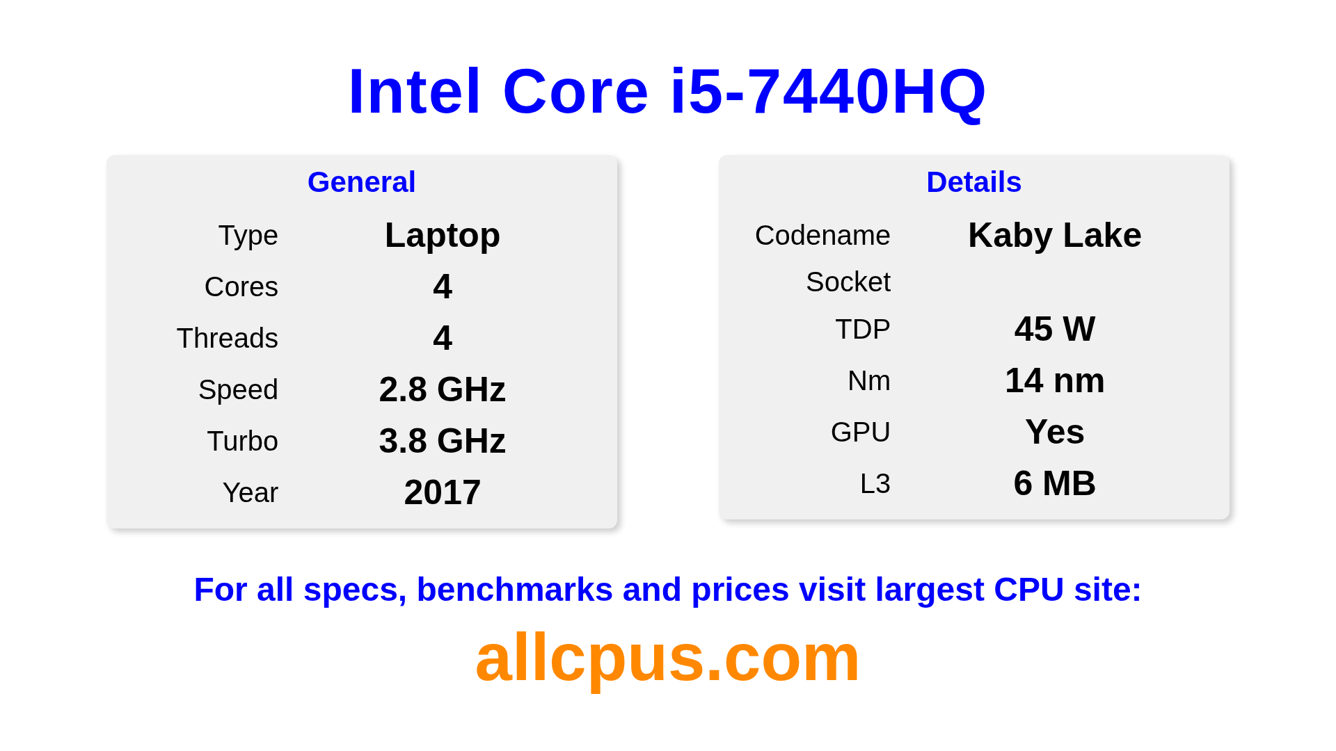 The Intel Core i5-7440HQ is a Intel laptop processor from the Intel Core lineup, built on the Kaby Lake architecture and released in 2017. This CPU features 4 cores, a base clock of 2800 MHz, maximum turbo frequency of 3800 MHz and 6 MB of L3 cache. Manufactured using 14 nm process technology. The Intel Core i5-7440HQ is designed for the socket. It includes integrated Intel® HD Graphics 630 graphics.