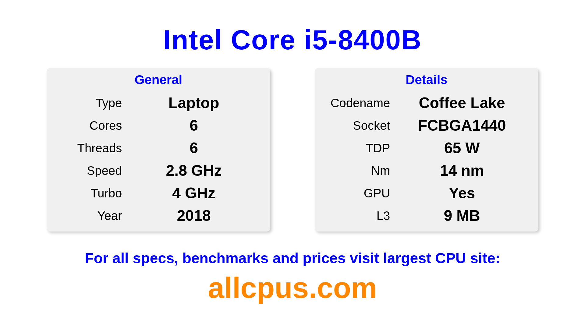 The Intel Core i5-8400B is a Intel laptop processor from the Intel Core lineup, built on the Coffee Lake architecture and released in 2018. This CPU features 6 cores, a base clock of 2800 MHz, maximum turbo frequency of 4000 MHz and 9 MB of L3 cache. Manufactured using 14 nm process technology. The Intel Core i5-8400B is designed for the BGA1440 socket. It includes integrated Intel® UHD Graphics 630 graphics.