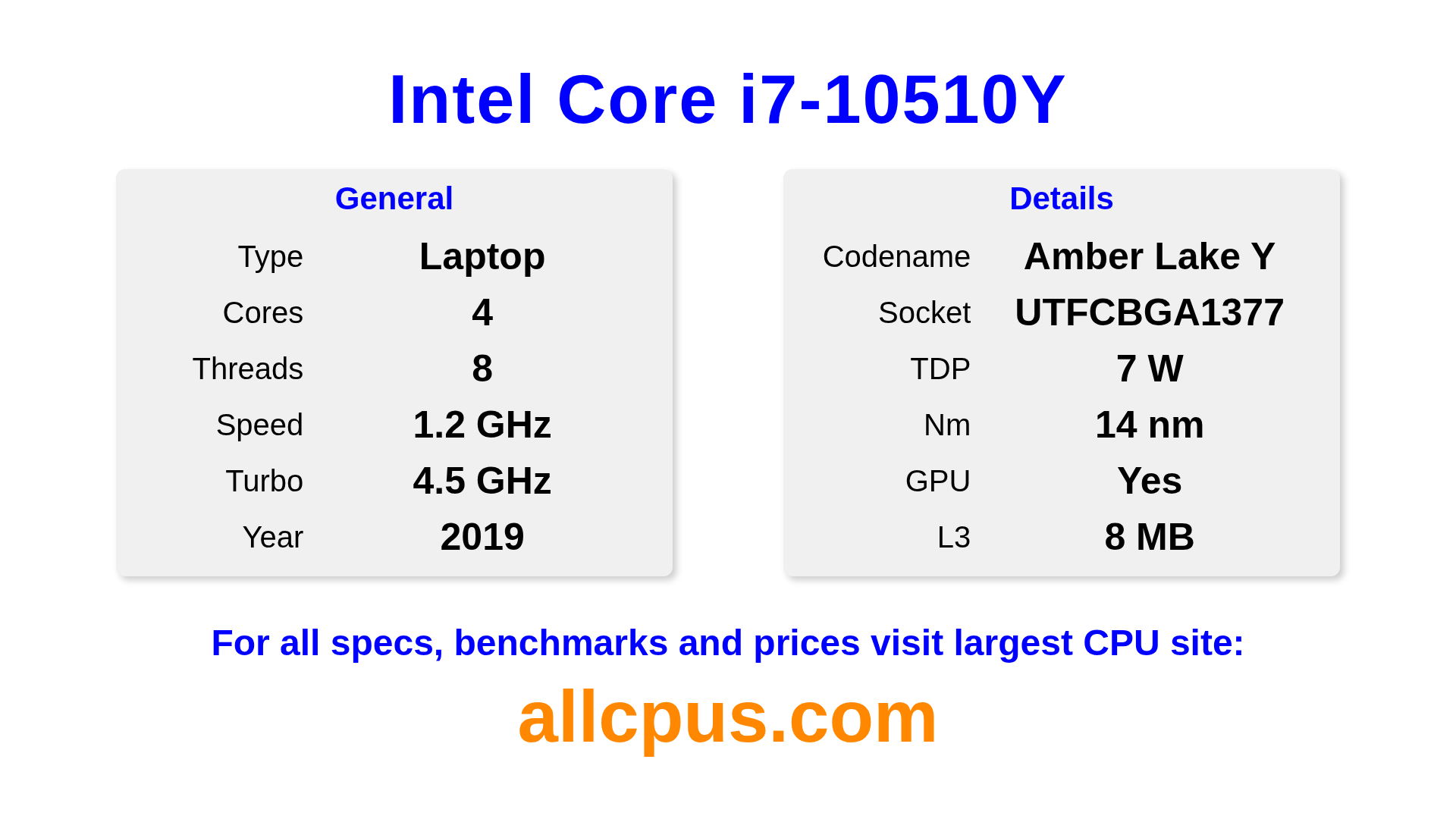 The Intel Core i7-10510Y is a Intel laptop processor from the Intel Core lineup, built on the Amber Lake Y architecture and released in 2019. This CPU features 4 cores, a base clock of 1200 MHz, maximum turbo frequency of 4500 MHz and 8 MB of L3 cache. Manufactured using 14 nm process technology. The Intel Core i7-10510Y is designed for the UTFCBGA1377 socket. It includes integrated Intel® UHD Graphics for 10th Gen Intel® Processors graphics.