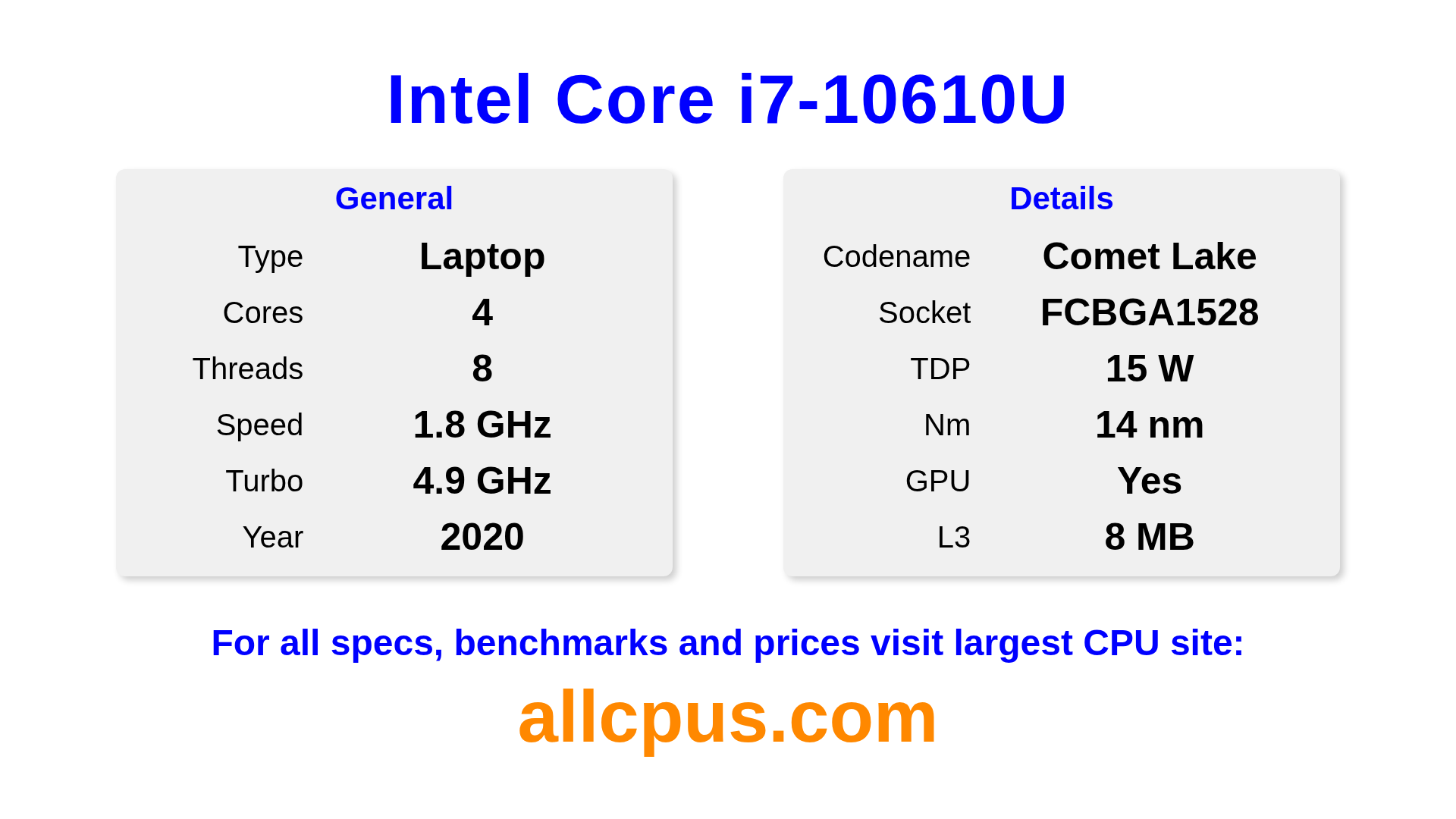 The Intel Core i7-10610U is a Intel laptop processor from the Intel Core lineup, built on the Comet Lake architecture and released in 2020. This CPU features 4 cores, a base clock of 1800 MHz, maximum turbo frequency of 4900 MHz and 8 MB of L3 cache. Manufactured using 14 nm process technology. The Intel Core i7-10610U is designed for the BGA1528 socket. It includes integrated Intel® UHD Graphics for 10th Gen Intel® Processors graphics.