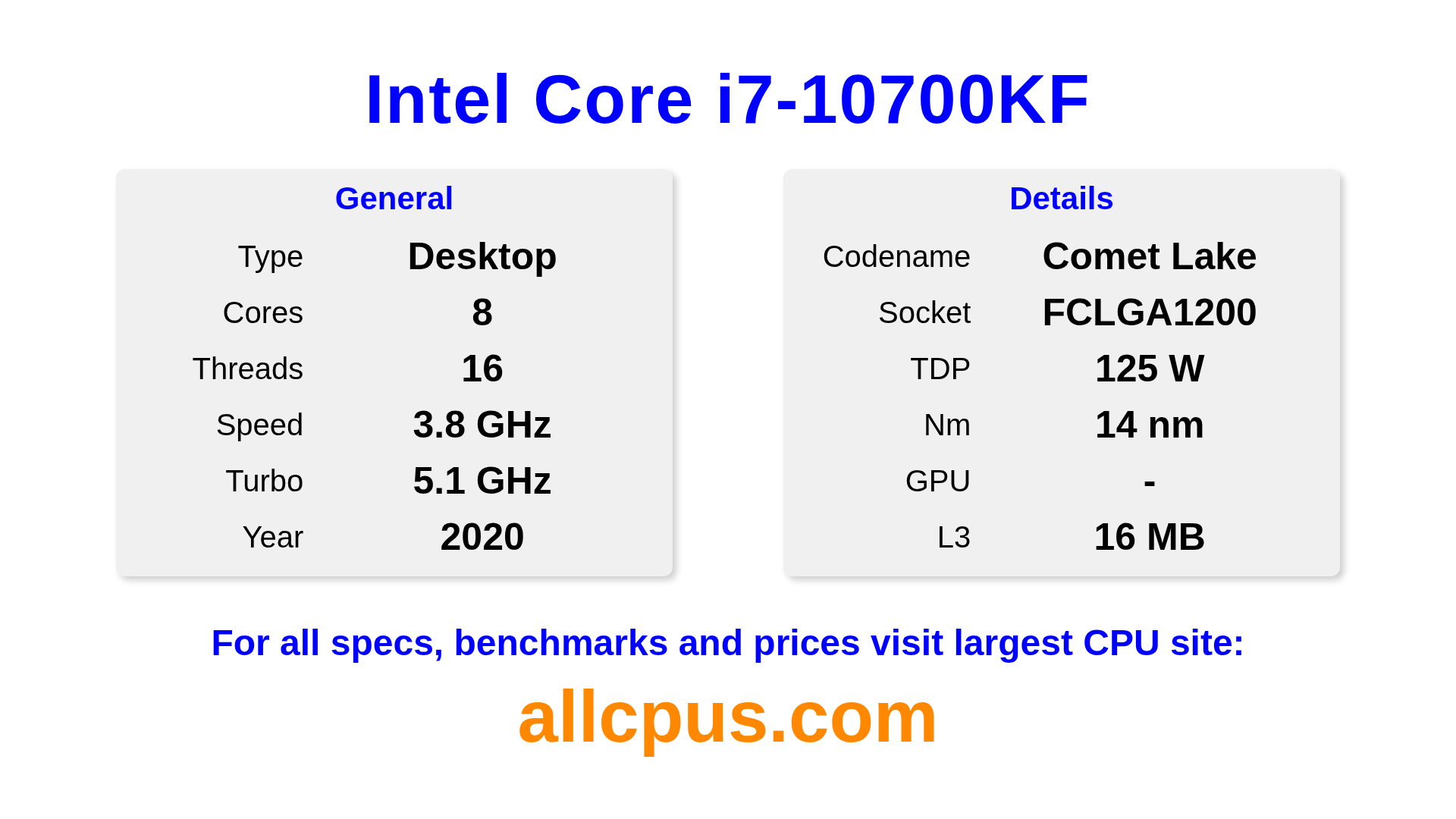 The Intel Core i7-10700KF is a Intel desktop processor from the Intel Core lineup, built on the Comet Lake architecture and released in 2020. This CPU features 8 cores, a base clock of 3800 MHz, maximum turbo frequency of 5100 MHz and 16 MB of L3 cache. Manufactured using 14 nm process technology. The Intel Core i7-10700KF is designed for the LGA1200 socket. A dedicated graphics card is required.
