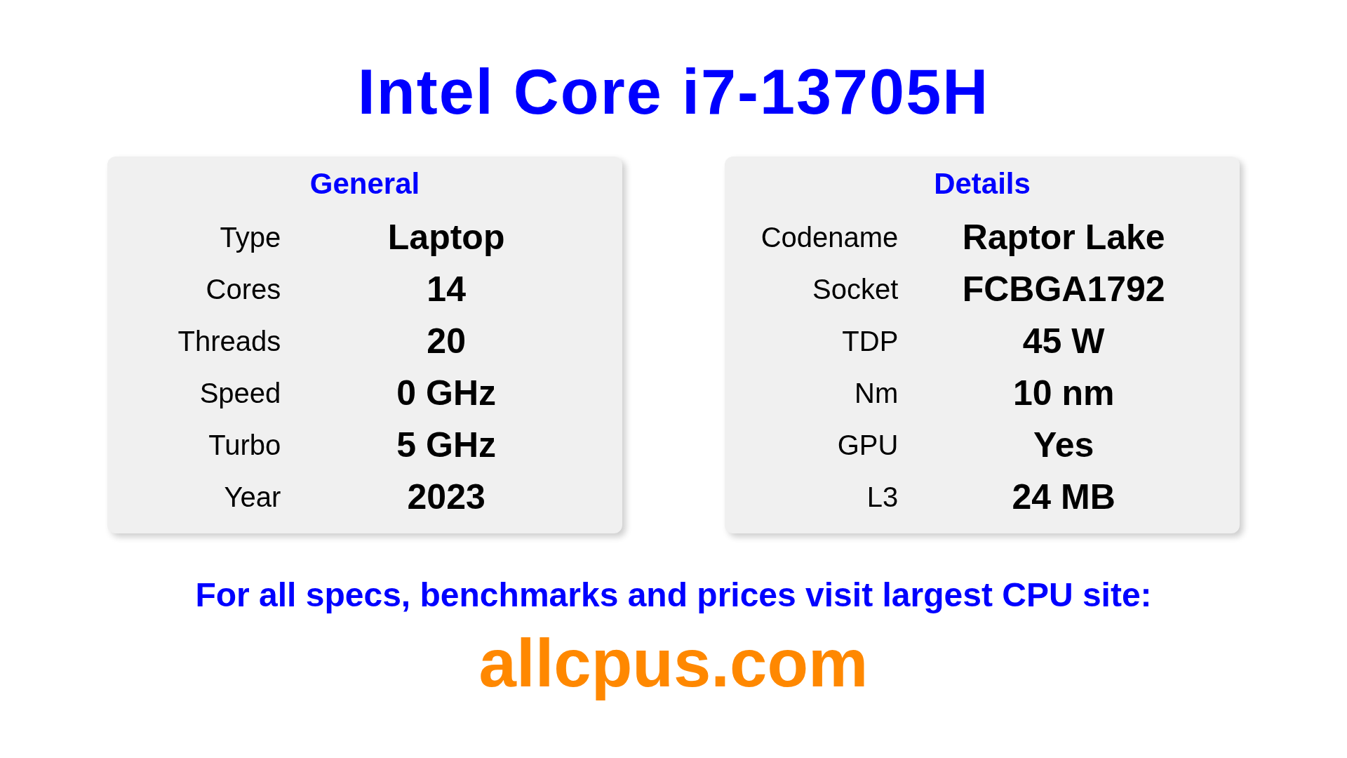 The Intel Core i7-13705H is a Intel laptop processor from the Intel Core lineup, built on the Raptor Lake architecture and released in 2023. This CPU features 14 cores, a base clock of 0 MHz, maximum turbo frequency of 5000 MHz and 24 MB of L3 cache. Manufactured using 10 nm process technology. The Intel Core i7-13705H is designed for the BGA1792 socket. It includes integrated Intel® Iris® Xe Graphics eligible graphics.