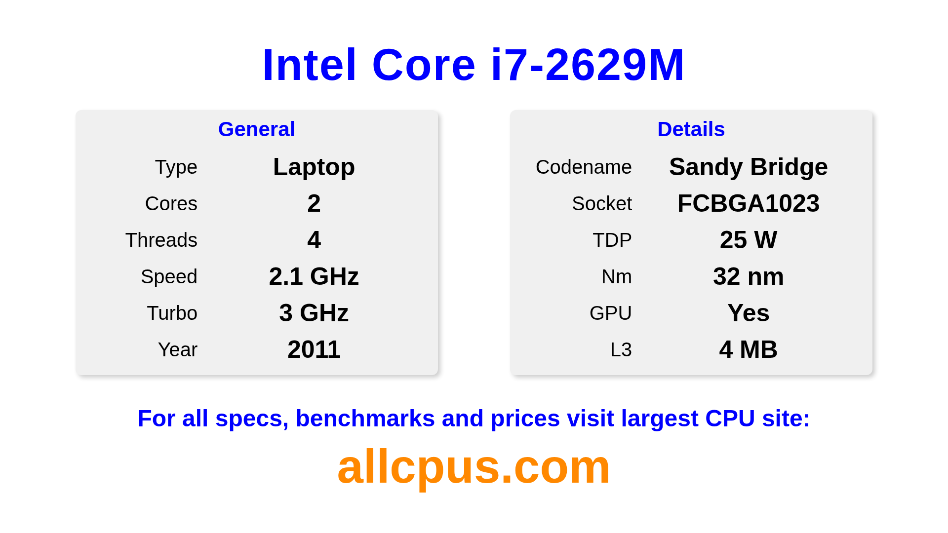 The Intel Core i7-2629M is a Intel laptop processor from the Intel Core lineup, built on the Sandy Bridge architecture and released in 2011. This CPU features 2 cores, a base clock of 2100 MHz, maximum turbo frequency of 3000 MHz and 4 MB of L3 cache. Manufactured using 32 nm process technology. The Intel Core i7-2629M is designed for the BGA1023 socket. It includes integrated Intel® HD Graphics 3000 graphics.