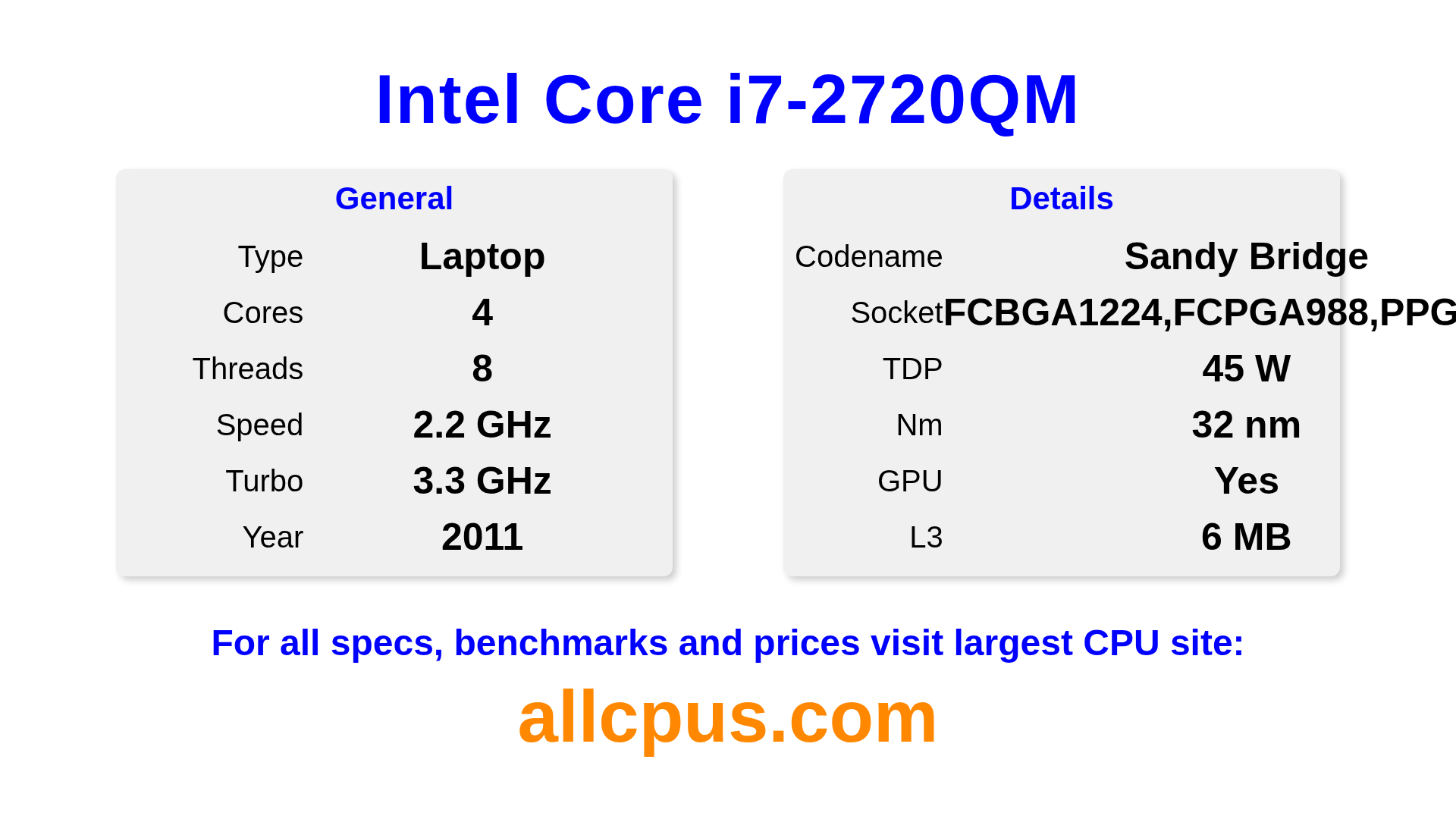 The Intel Core i7-2720QM is a Intel laptop processor from the Intel Core lineup, built on the Sandy Bridge architecture and released in 2011. This CPU features 4 cores, a base clock of 2200 MHz, maximum turbo frequency of 3300 MHz and 6 MB of L3 cache. Manufactured using 32 nm process technology. The Intel Core i7-2720QM is designed for the BGA1224,FCPGA988,PPGA988 socket. It includes integrated Intel® HD Graphics 3000 graphics.