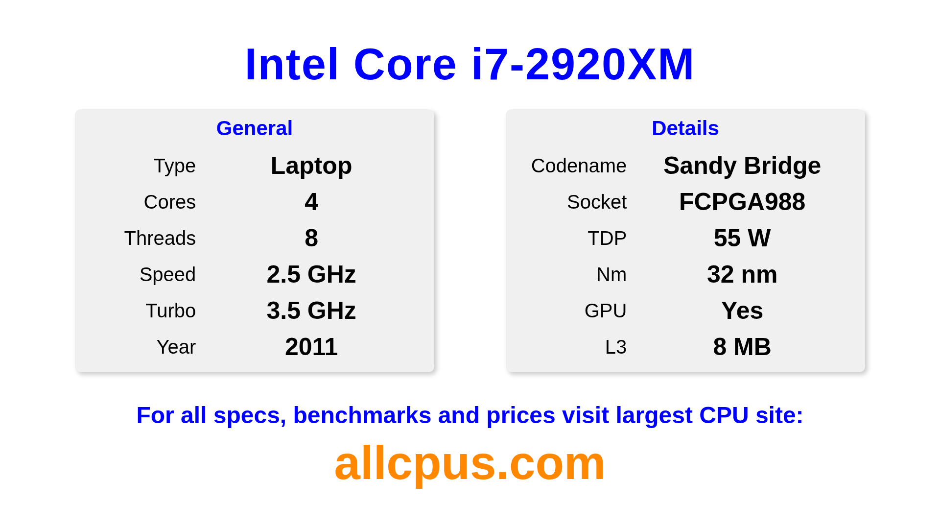 The Intel Core i7-2920XM is a Intel laptop processor from the Intel Core lineup, built on the Sandy Bridge architecture and released in 2011. This CPU features 4 cores, a base clock of 2500 MHz, maximum turbo frequency of 3500 MHz and 8 MB of L3 cache. Manufactured using 32 nm process technology. The Intel Core i7-2920XM is designed for the PGA988 socket. It includes integrated Intel® HD Graphics 3000 graphics.