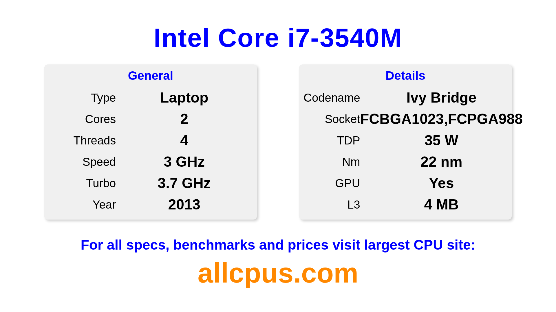 The Intel Core i7-3540M is a Intel laptop processor from the Intel Core lineup, built on the Ivy Bridge architecture and released in 2013. This CPU features 2 cores, a base clock of 3000 MHz, maximum turbo frequency of 3700 MHz and 4 MB of L3 cache. Manufactured using 22 nm process technology. The Intel Core i7-3540M is designed for the BGA1023,FCPGA988 socket. It includes integrated Intel® HD Graphics 4000 graphics.