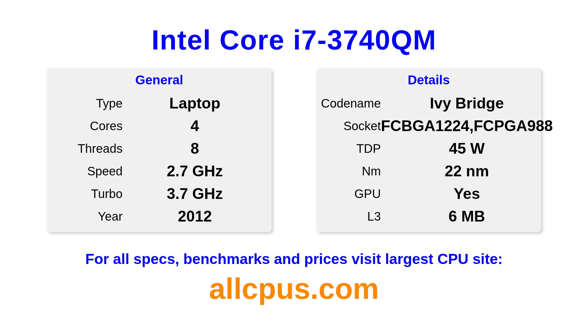 The Intel Core i7-3740QM is a Intel laptop processor from the Intel Core lineup, built on the Ivy Bridge architecture and released in 2012. This CPU features 4 cores, a base clock of 2700 MHz, maximum turbo frequency of 3700 MHz and 6 MB of L3 cache. Manufactured using 22 nm process technology. The Intel Core i7-3740QM is designed for the BGA1224,FCPGA988 socket. It includes integrated Intel® HD Graphics 4000 graphics.