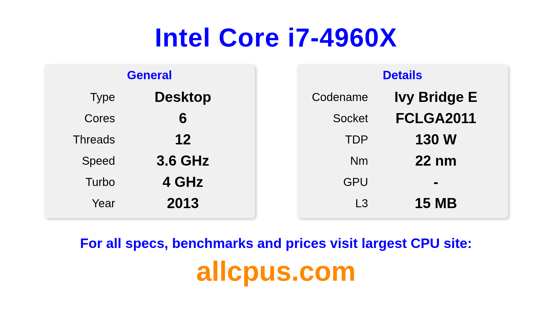The Intel Core i7-4960X is a Intel desktop processor from the Intel Core lineup, built on the Ivy Bridge E architecture and released in 2013. This CPU features 6 cores, a base clock of 3600 MHz, maximum turbo frequency of 4000 MHz and 15 MB of L3 cache. Manufactured using 22 nm process technology. The Intel Core i7-4960X is designed for the LGA2011 socket.It supports overclocking. A dedicated graphics card is required.