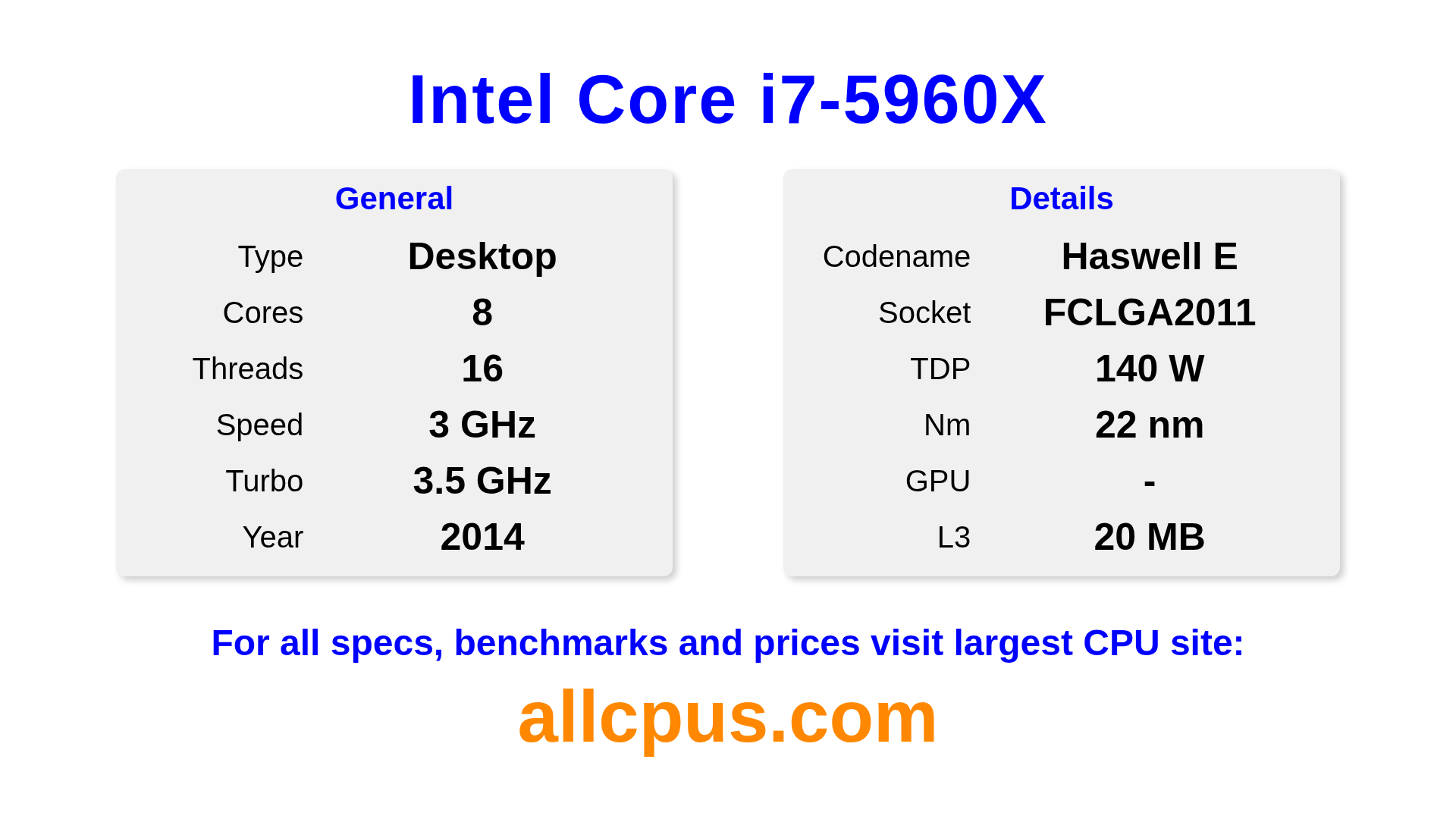 The Intel Core i7-5960X is a Intel desktop processor from the Intel Core lineup, built on the Haswell E architecture and released in 2014. This CPU features 8 cores, a base clock of 3000 MHz, maximum turbo frequency of 3500 MHz and 20 MB of L3 cache. Manufactured using 22 nm process technology. The Intel Core i7-5960X is designed for the LGA2011 socket.It supports overclocking. A dedicated graphics card is required.