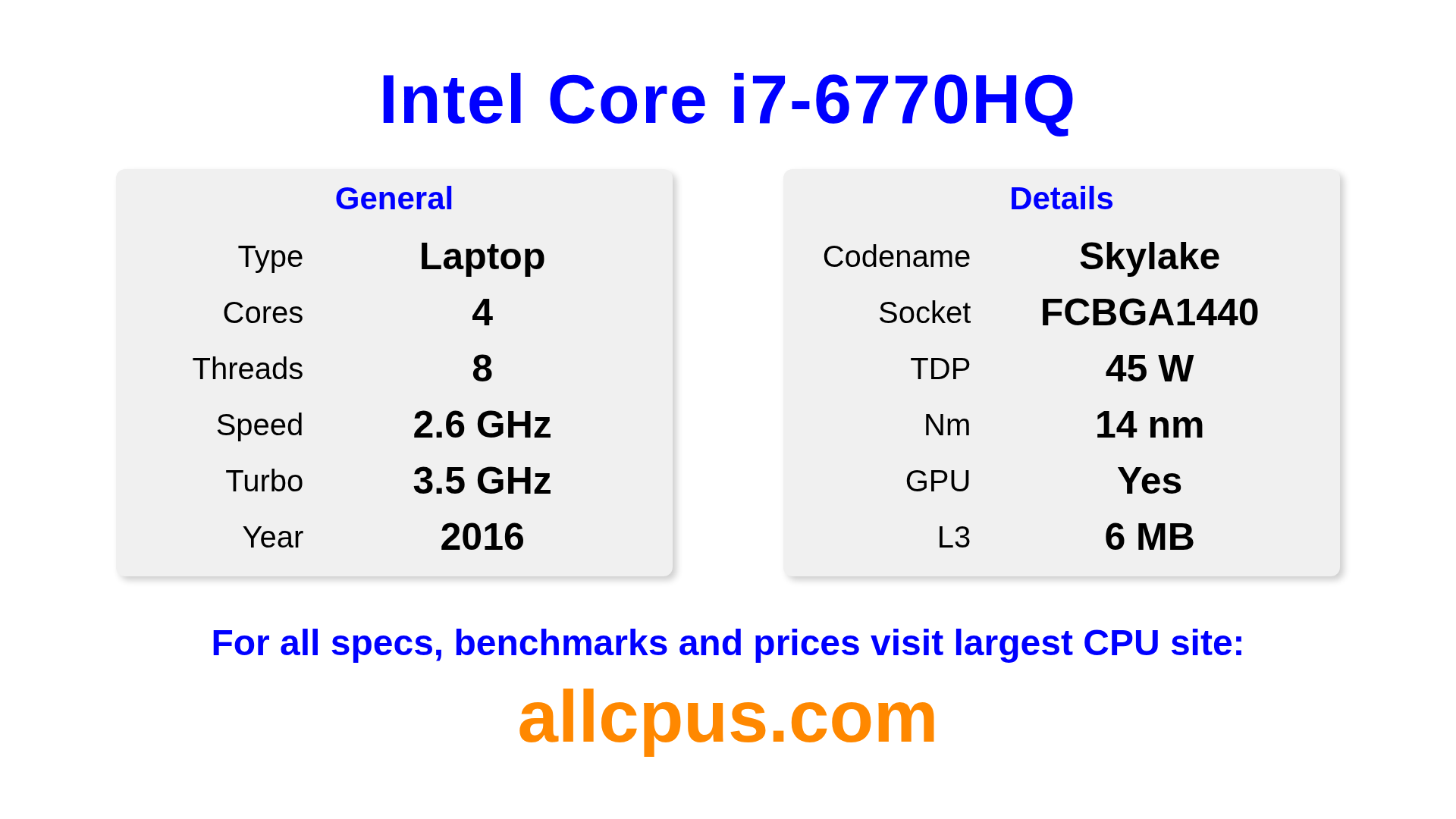 The Intel Core i7-6770HQ is a Intel laptop processor from the Intel Core lineup, built on the Skylake architecture and released in 2016. This CPU features 4 cores, a base clock of 2600 MHz, maximum turbo frequency of 3500 MHz and 6 MB of L3 cache. Manufactured using 14 nm process technology. The Intel Core i7-6770HQ is designed for the BGA1440 socket. It includes integrated Intel® Iris® Pro Graphics 580 graphics.