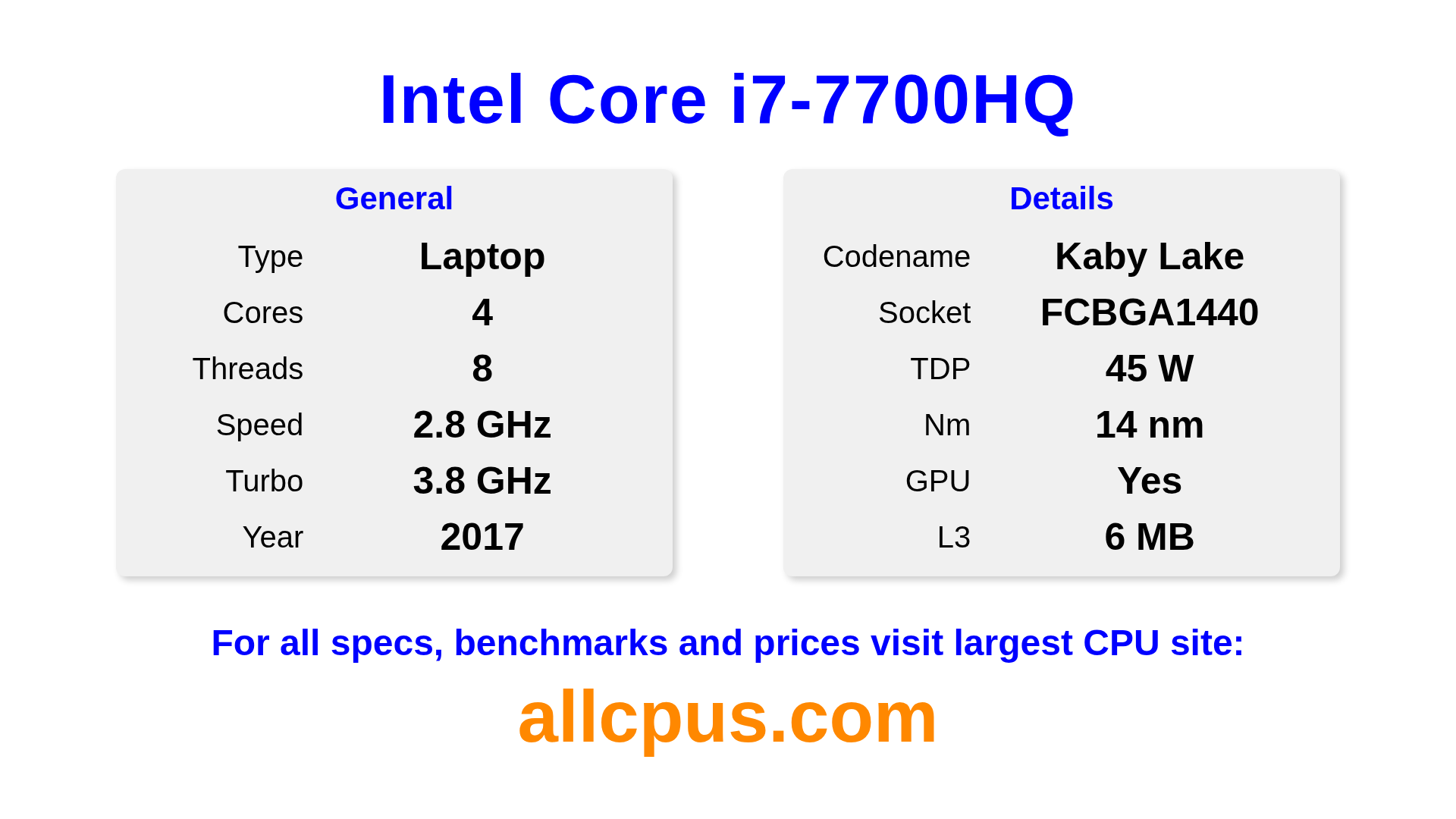The Intel Core i7-7700HQ is a Intel laptop processor from the Intel Core lineup, built on the Kaby Lake architecture and released in 2017. This CPU features 4 cores, a base clock of 2800 MHz, maximum turbo frequency of 3800 MHz and 6 MB of L3 cache. Manufactured using 14 nm process technology. The Intel Core i7-7700HQ is designed for the BGA1440 socket. It includes integrated Intel® HD Graphics 630 graphics.