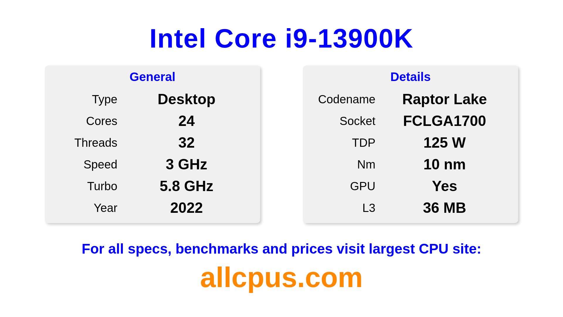 The Intel Core i9-13900K is a Intel desktop processor from the Intel Core lineup, built on the Raptor Lake architecture and released in 2022. This CPU features 24 cores, a base clock of 3000 MHz, maximum turbo frequency of 5800 MHz and 36 MB of L3 cache. Manufactured using 10 nm process technology. The Intel Core i9-13900K is designed for the LGA1700 socket.It supports overclocking. It includes integrated Intel® UHD Graphics 770 graphics.