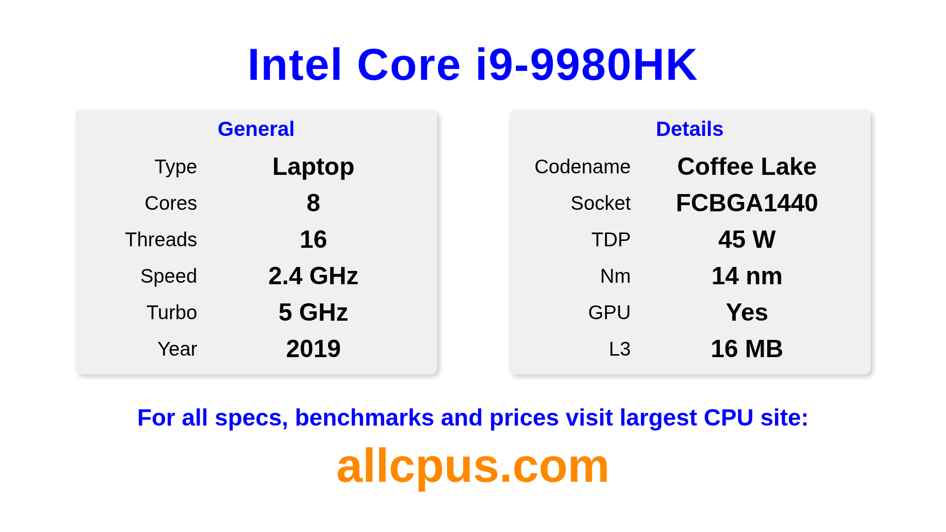 The Intel Core i9-9980HK is a Intel laptop processor from the Intel Core lineup, built on the Coffee Lake architecture and released in 2019. This CPU features 8 cores, a base clock of 2400 MHz, maximum turbo frequency of 5000 MHz and 16 MB of L3 cache. Manufactured using 14 nm process technology. The Intel Core i9-9980HK is designed for the BGA1440 socket.It supports overclocking. It includes integrated Intel® UHD Graphics 630 graphics.