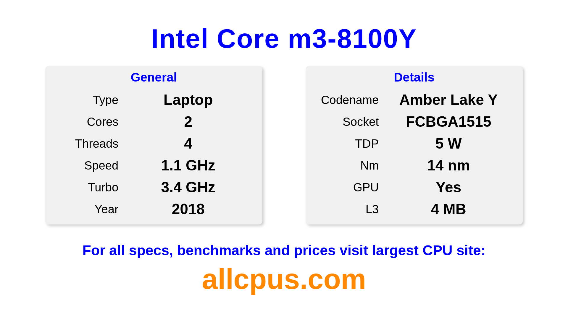 The Intel Core m3-8100Y is a Intel laptop processor from the Intel Core lineup, built on the Amber Lake Y architecture and released in 2018. This CPU features 2 cores, a base clock of 1100 MHz, maximum turbo frequency of 3400 MHz and 4 MB of L3 cache. Manufactured using 14 nm process technology. The Intel Core m3-8100Y is designed for the BGA1515 socket. It includes integrated Intel® UHD Graphics 615 graphics.