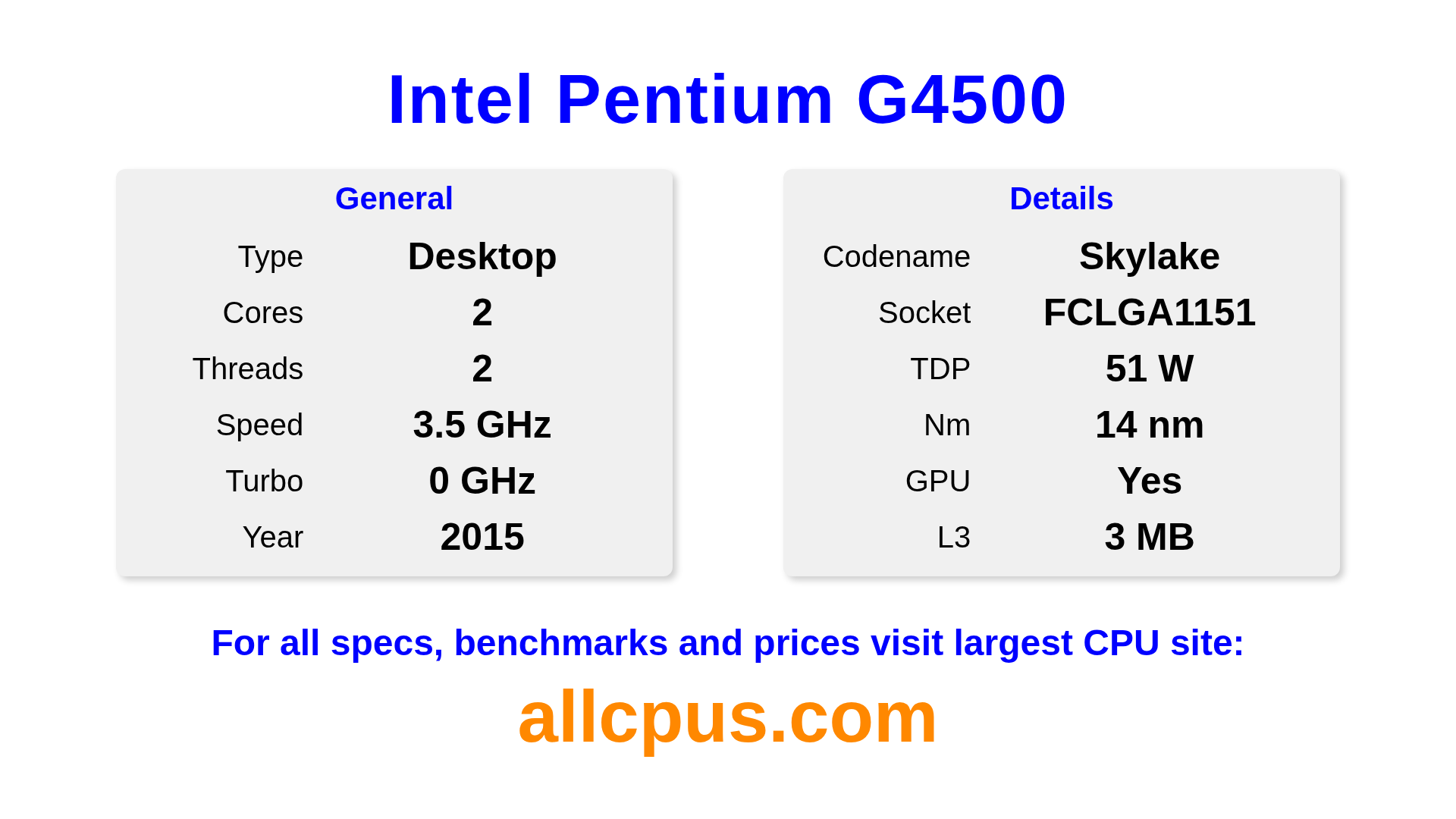 The Intel Pentium G4500 is a Intel desktop processor from the Intel® Pentium® lineup, built on the Skylake architecture and released in 2015. This CPU features 2 cores, a base clock of 3500 MHz, maximum turbo frequency of 0 MHz and 3 MB of L3 cache. Manufactured using 14 nm process technology. The Intel Pentium G4500 is designed for the LGA1151 socket. It includes integrated Intel® HD Graphics 530 graphics.