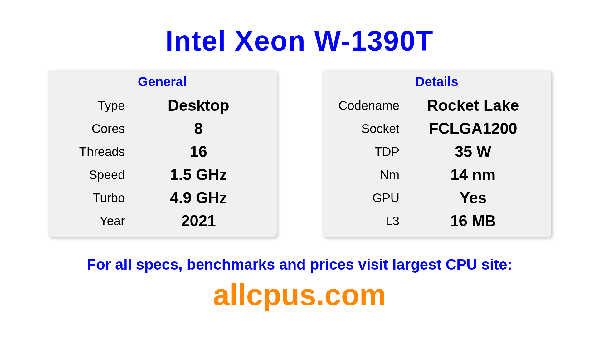 The Intel Xeon W-1390T is a Intel desktop processor from the Intel Xeon lineup, built on the Rocket Lake architecture and released in 2021. This CPU features 8 cores, a base clock of 1500 MHz, maximum turbo frequency of 4900 MHz and 16 MB of L3 cache. Manufactured using 14 nm process technology. The Intel Xeon W-1390T is designed for the LGA1200 socket. It includes integrated Intel® UHD Graphics P750 graphics.