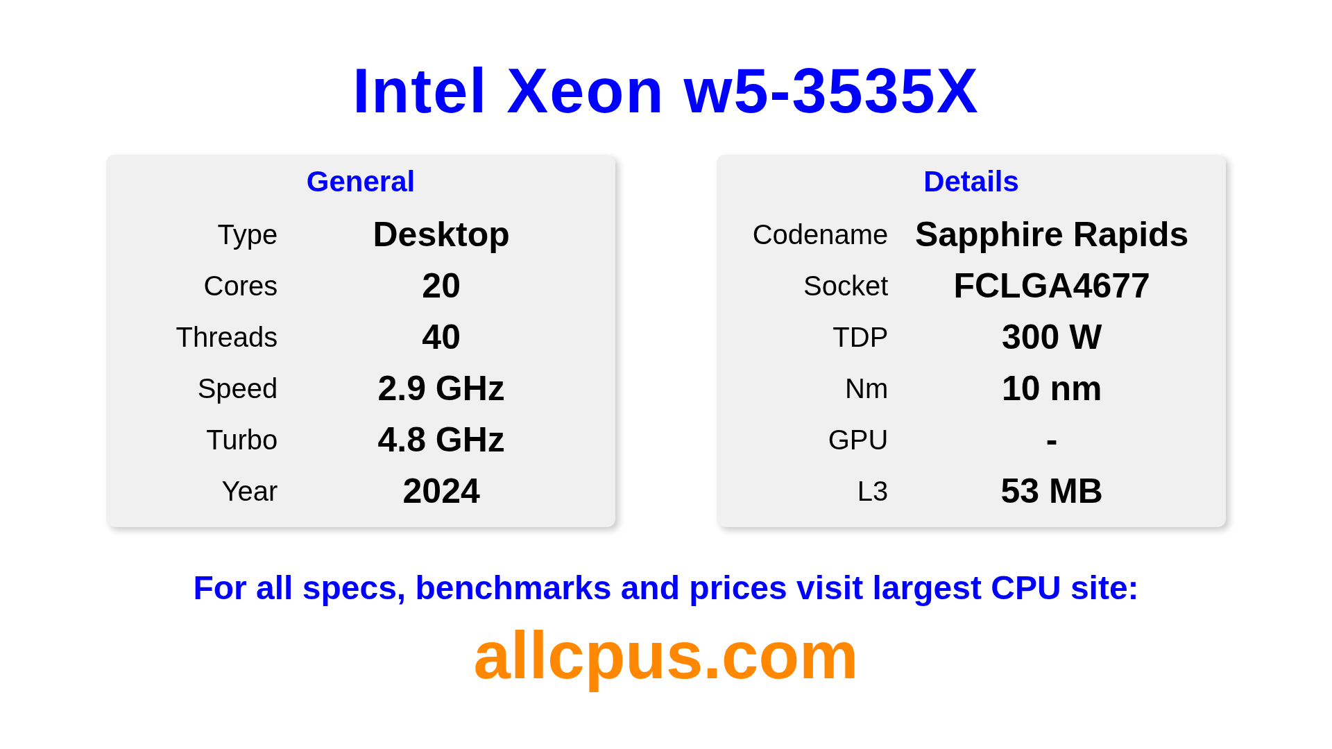 The Intel Xeon w5-3535X is a Intel desktop processor from the Intel Xeon lineup, built on the Sapphire Rapids architecture and released in 2024. This CPU features 20 cores, a base clock of 2900 MHz, maximum turbo frequency of 4800 MHz and 53 MB of L3 cache. Manufactured using 10 nm process technology. The Intel Xeon w5-3535X is designed for the LGA4677 socket.It supports overclocking. A dedicated graphics card is required.