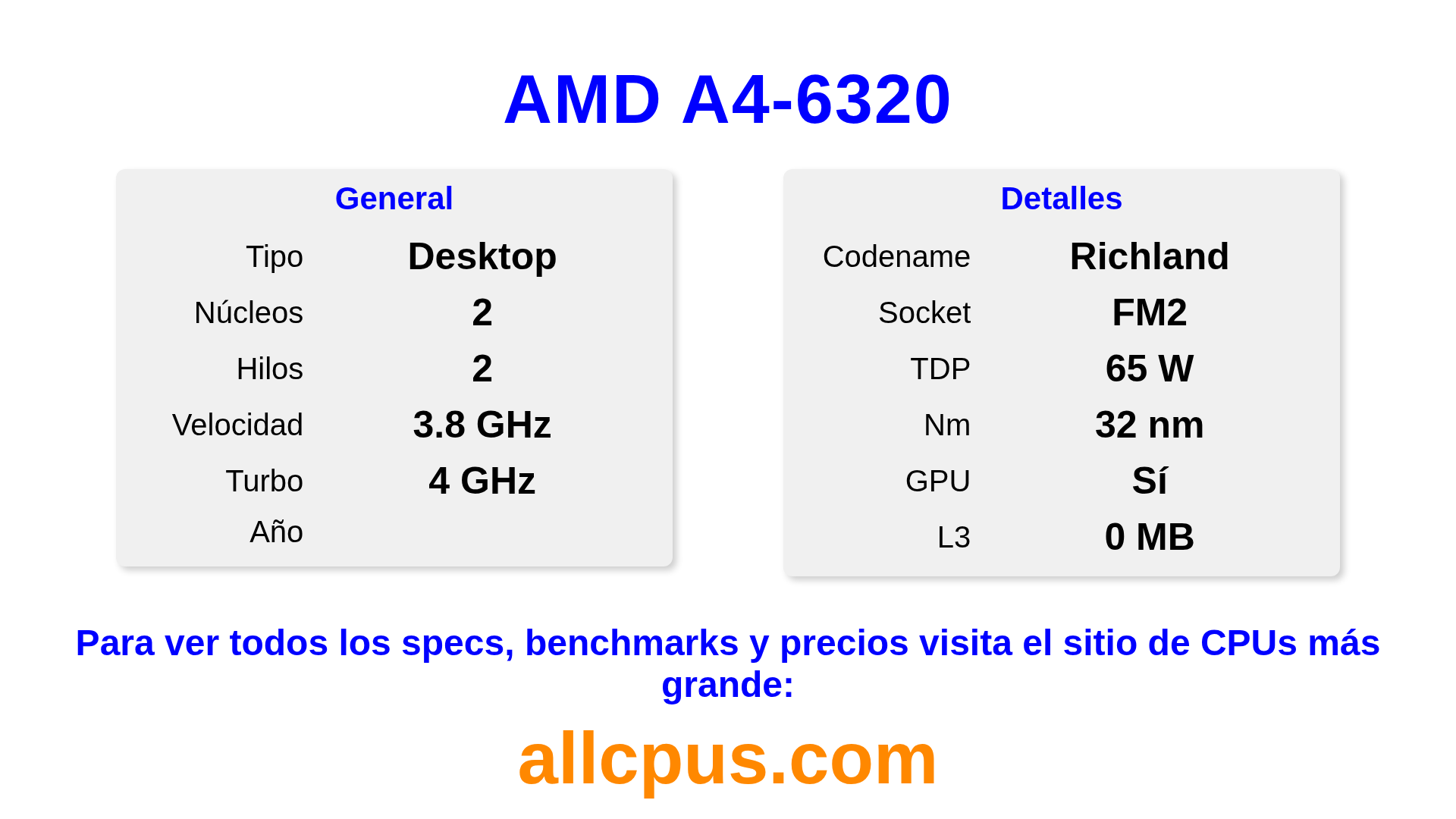 El AMD A4-6320 es un procesador de escritorio de AMD de la gama A-Series, basado en la arquitectura Richland y lanzado en . Esta CPU cuenta con 2 núcleos, una frecuencia base de 3800 MHz, una frecuencia turbo máxima de 4000 MHz y 0 MB de caché L3. Fabricado usando tecnología de proceso de 32 nm.El AMD A4-6320 está diseñado para el socket FM2. Incluye gráficos integrados AMD Radeon HD 8370D.