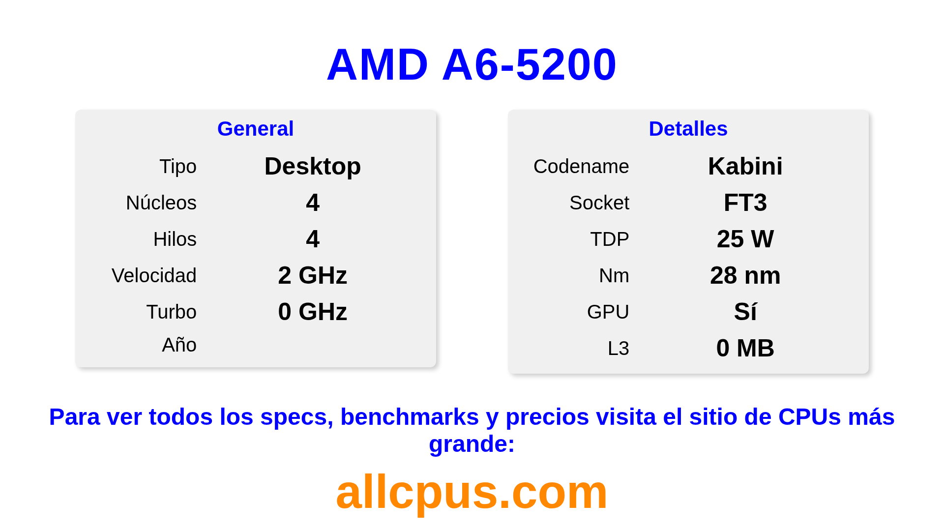 El AMD A6-5200 es un procesador de escritorio de AMD de la gama A-Series, basado en la arquitectura Kabini y lanzado en . Esta CPU cuenta con 4 núcleos, una frecuencia base de 2000 MHz, una frecuencia turbo máxima de 0 MHz y 0 MB de caché L3. Fabricado usando tecnología de proceso de 28 nm.El AMD A6-5200 está diseñado para el socket FT3. Incluye gráficos integrados AMD Radeon HD 8400.