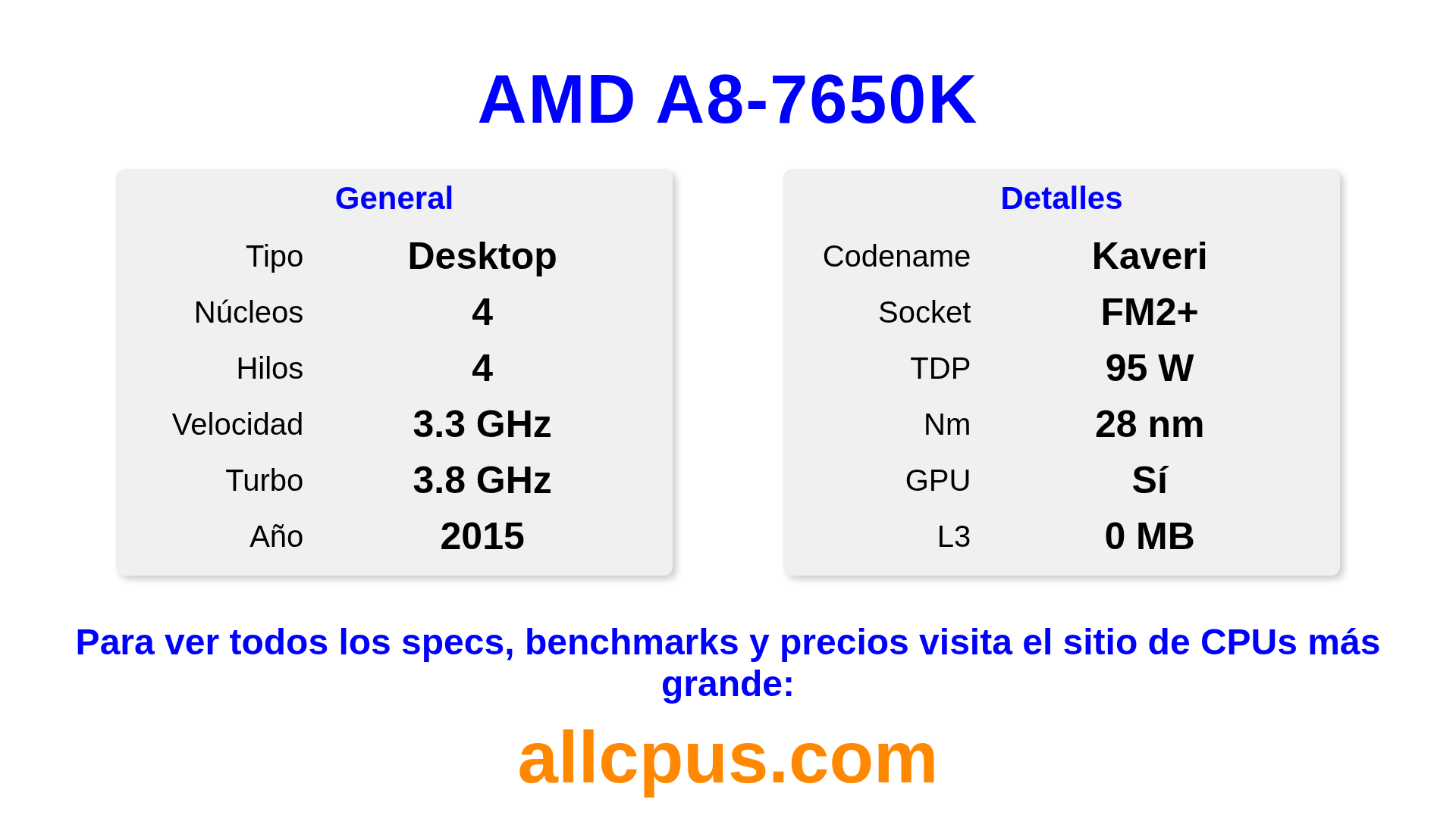 El AMD A8-7650K es un procesador de escritorio de AMD de la gama A-Series, basado en la arquitectura Kaveri y lanzado en 2015. Esta CPU cuenta con 4 núcleos, una frecuencia base de 3300 MHz, una frecuencia turbo máxima de 3800 MHz y 0 MB de caché L3. Fabricado usando tecnología de proceso de 28 nm.El AMD A8-7650K está diseñado para el socket FM2+.Admite overclocking. Incluye gráficos integrados AMD Radeon R7 Graphics.