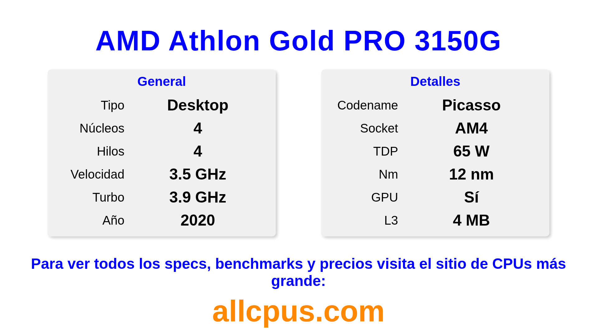 El AMD Athlon Gold PRO 3150G es un procesador de escritorio de AMD de la gama Athlon PRO, basado en la arquitectura Picasso y lanzado en 2020. Esta CPU cuenta con 4 núcleos, una frecuencia base de 3500 MHz, una frecuencia turbo máxima de 3900 MHz y 4 MB de caché L3. Fabricado usando tecnología de proceso de 12 nm.El AMD Athlon Gold PRO 3150G está diseñado para el socket AM4. Incluye gráficos integrados Radeon Graphics.