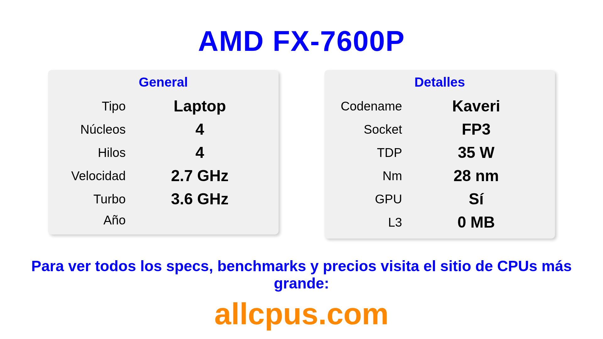 El AMD FX-7600P es un procesador portátil de AMD de la gama FX-Series, basado en la arquitectura Kaveri y lanzado en . Esta CPU cuenta con 4 núcleos, una frecuencia base de 2700 MHz, una frecuencia turbo máxima de 3600 MHz y 0 MB de caché L3. Fabricado usando tecnología de proceso de 28 nm.El AMD FX-7600P está diseñado para el socket FP3. Incluye gráficos integrados AMD Radeon R7 Graphics.