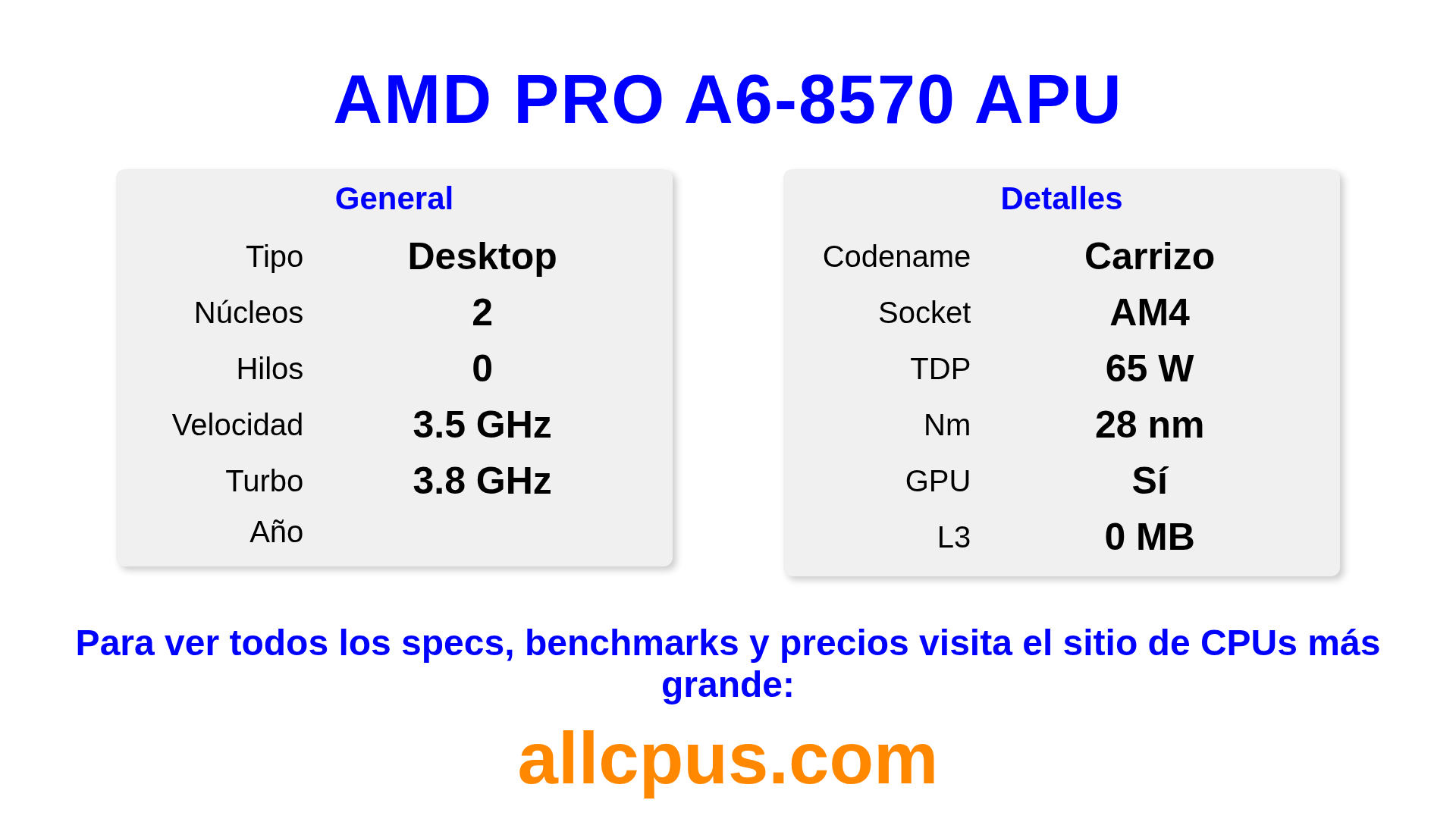 El AMD PRO A6-8570 APU es un procesador de escritorio de AMD de la gama PRO A-Series, basado en la arquitectura Carrizo y lanzado en . Esta CPU cuenta con 2 núcleos, una frecuencia base de 3500 MHz, una frecuencia turbo máxima de 3800 MHz y 0 MB de caché L3. Fabricado usando tecnología de proceso de 28 nm.El AMD PRO A6-8570 APU está diseñado para el socket AM4. Incluye gráficos integrados R5.