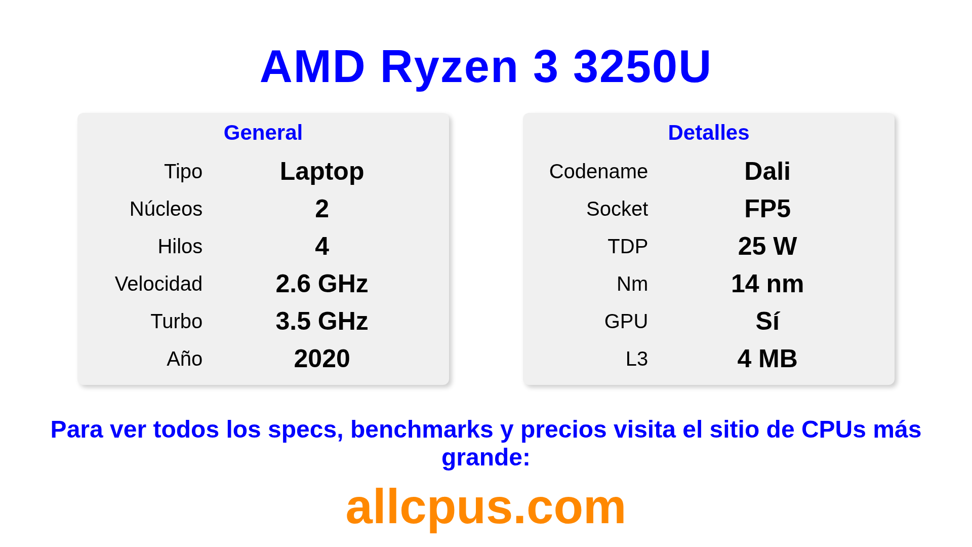 El AMD Ryzen 3 3250U es un procesador portátil de AMD de la gama Ryzen, basado en la arquitectura Dali y lanzado en 2020. Esta CPU cuenta con 2 núcleos, una frecuencia base de 2600 MHz, una frecuencia turbo máxima de 3500 MHz y 4 MB de caché L3. Fabricado usando tecnología de proceso de 14 nm.El AMD Ryzen 3 3250U está diseñado para el socket FP5.Admite overclocking. Incluye gráficos integrados AMD Radeon Graphics.