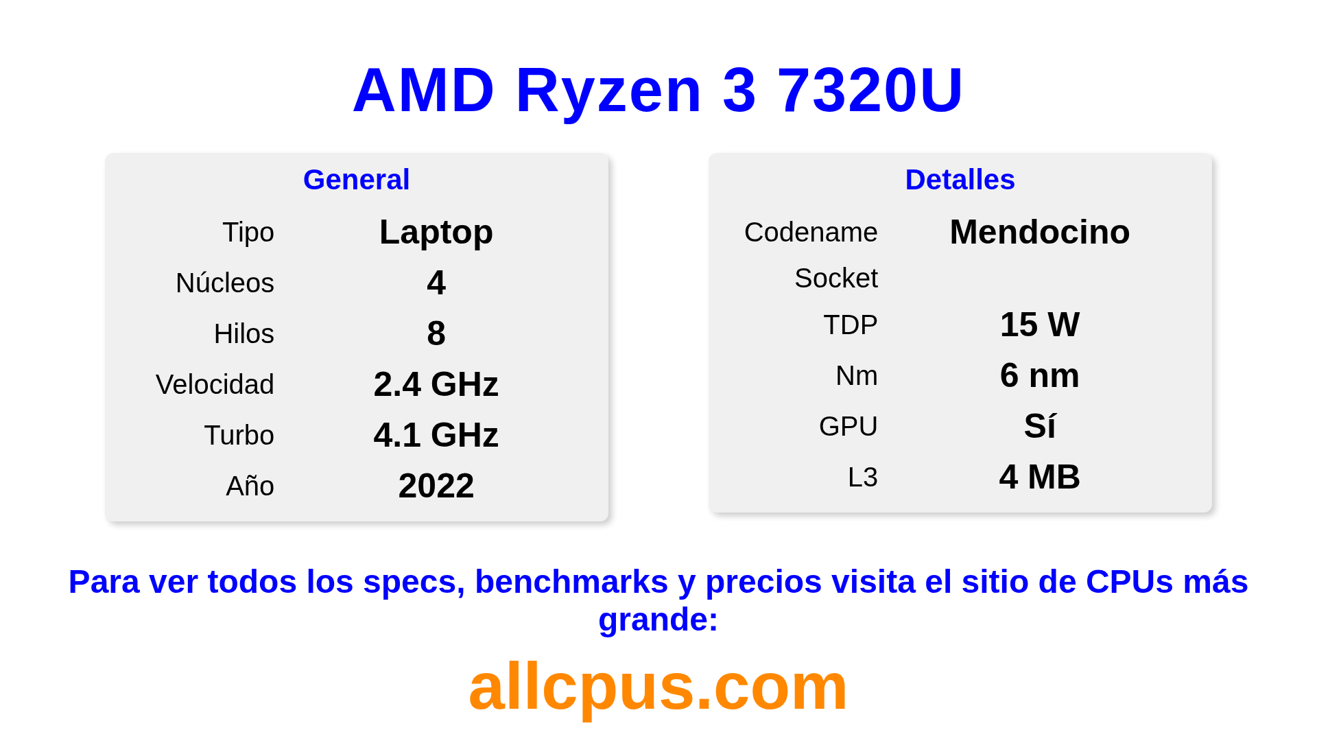 El AMD Ryzen 3 7320U es un procesador portátil de AMD de la gama Ryzen, basado en la arquitectura Mendocino y lanzado en 2022. Esta CPU cuenta con 4 núcleos, una frecuencia base de 2400 MHz, una frecuencia turbo máxima de 4100 MHz y 4 MB de caché L3. Fabricado usando tecnología de proceso de 6 nm.El AMD Ryzen 3 7320U está diseñado para el socket . Incluye gráficos integrados AMD Radeon 610M.