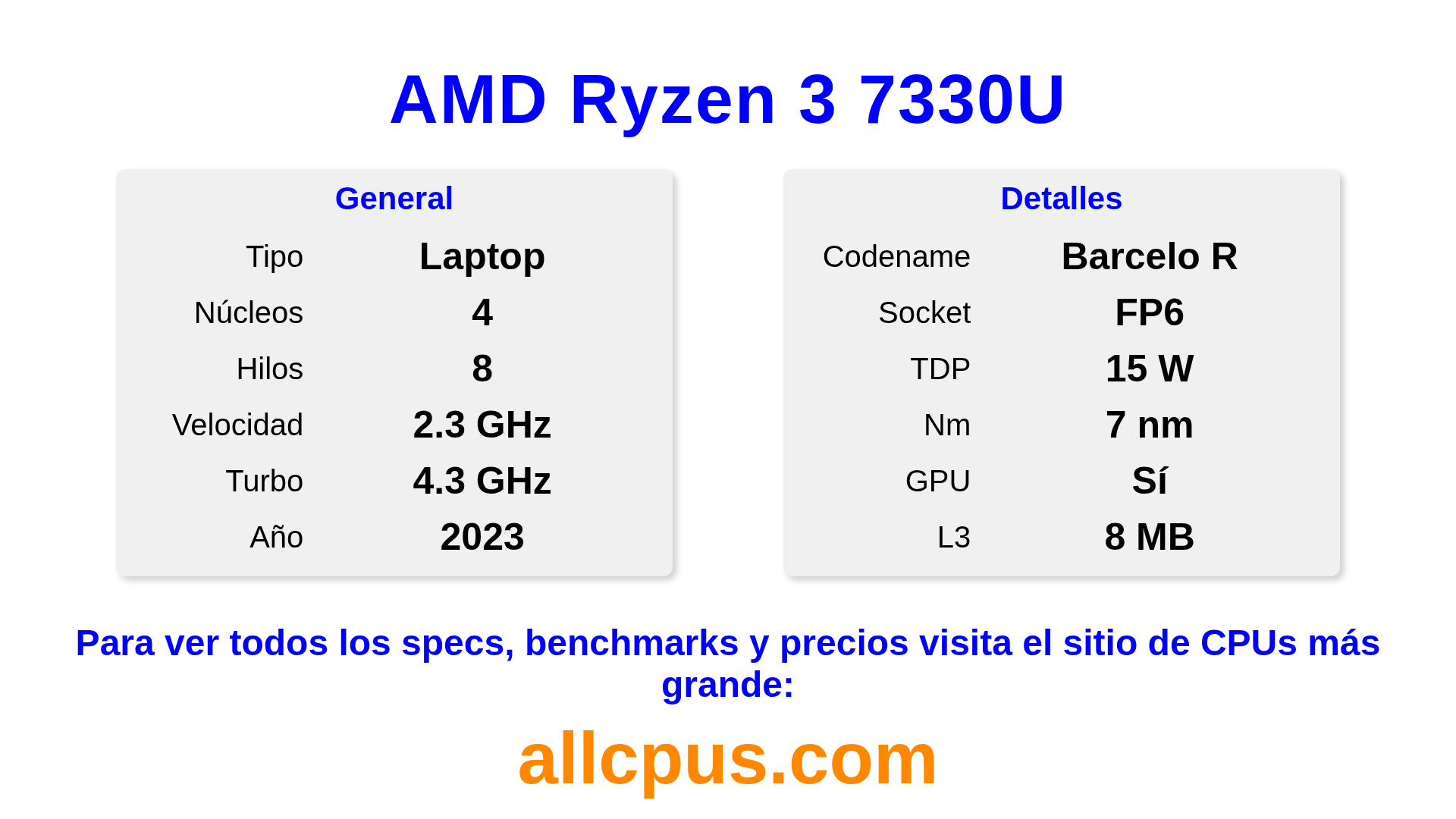 El AMD Ryzen 3 7330U es un procesador portátil de AMD de la gama Ryzen, basado en la arquitectura Barcelo R y lanzado en 2023. Esta CPU cuenta con 4 núcleos, una frecuencia base de 2300 MHz, una frecuencia turbo máxima de 4300 MHz y 8 MB de caché L3. Fabricado usando tecnología de proceso de 7 nm.El AMD Ryzen 3 7330U está diseñado para el socket FP6. Incluye gráficos integrados AMD Radeon Graphics.