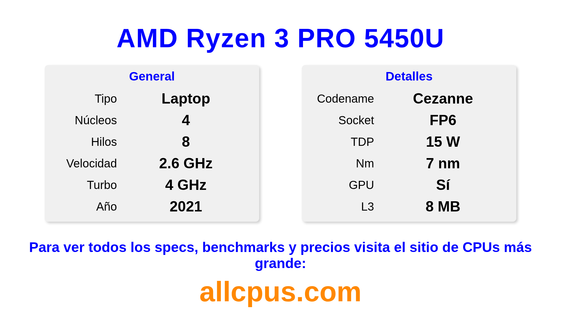 El AMD Ryzen 3 PRO 5450U es un procesador portátil de AMD de la gama Ryzen PRO, basado en la arquitectura Cezanne y lanzado en 2021. Esta CPU cuenta con 4 núcleos, una frecuencia base de 2600 MHz, una frecuencia turbo máxima de 4000 MHz y 8 MB de caché L3. Fabricado usando tecnología de proceso de 7 nm.El AMD Ryzen 3 PRO 5450U está diseñado para el socket FP6. Incluye gráficos integrados AMD Radeon Graphics.