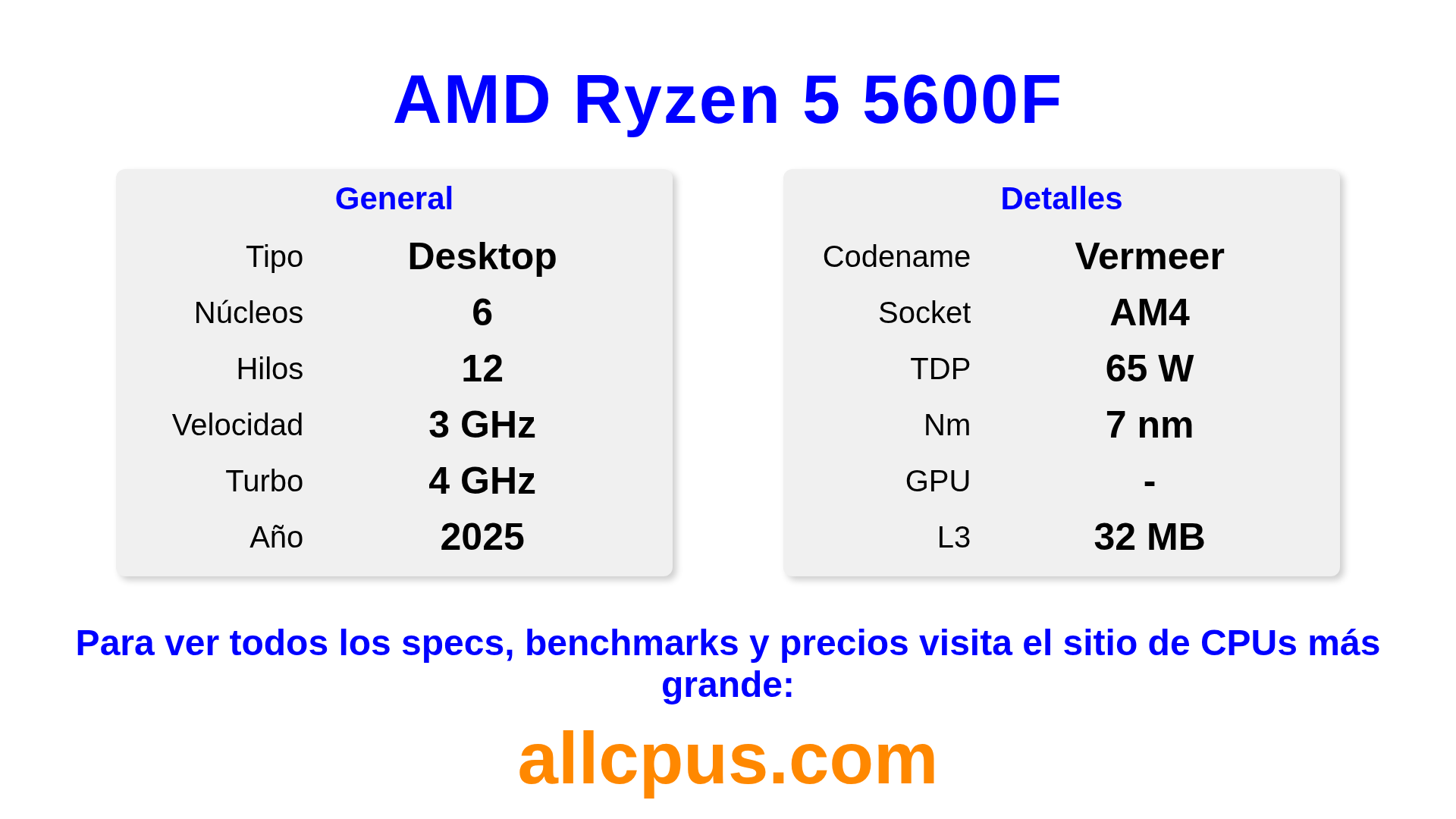 El AMD Ryzen 5 5600F es un procesador de escritorio de AMD de la gama Ryzen, basado en la arquitectura Vermeer y lanzado en 2025. Esta CPU cuenta con 6 núcleos, una frecuencia base de 3000 MHz, una frecuencia turbo máxima de 4000 MHz y 32 MB de caché L3. Fabricado usando tecnología de proceso de 7 nm.El AMD Ryzen 5 5600F está diseñado para el socket AM4.Admite overclocking. Se requiere una tarjeta gráfica dedicada.