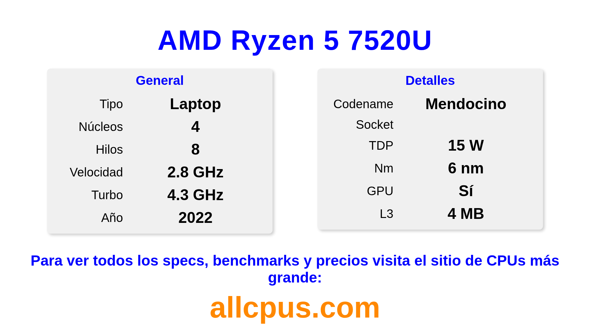 El AMD Ryzen 5 7520U es un procesador portátil de AMD de la gama Ryzen, basado en la arquitectura Mendocino y lanzado en 2022. Esta CPU cuenta con 4 núcleos, una frecuencia base de 2800 MHz, una frecuencia turbo máxima de 4300 MHz y 4 MB de caché L3. Fabricado usando tecnología de proceso de 6 nm.El AMD Ryzen 5 7520U está diseñado para el socket . Incluye gráficos integrados AMD Radeon 610M.