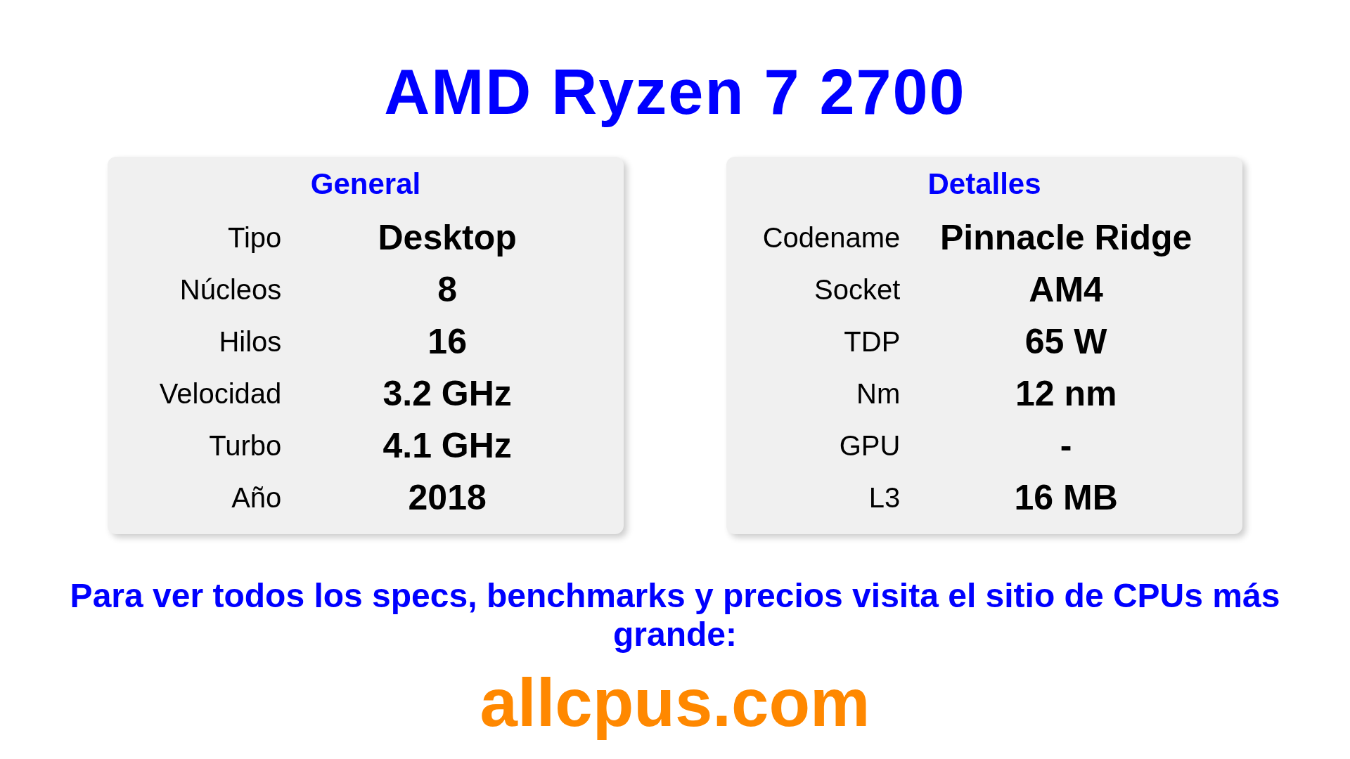 El AMD Ryzen 7 2700 es un procesador de escritorio de AMD de la gama Ryzen, basado en la arquitectura Pinnacle Ridge y lanzado en 2018. Esta CPU cuenta con 8 núcleos, una frecuencia base de 3200 MHz, una frecuencia turbo máxima de 4100 MHz y 16 MB de caché L3. Fabricado usando tecnología de proceso de 12 nm.El AMD Ryzen 7 2700 está diseñado para el socket AM4.Admite overclocking. Se requiere una tarjeta gráfica dedicada.