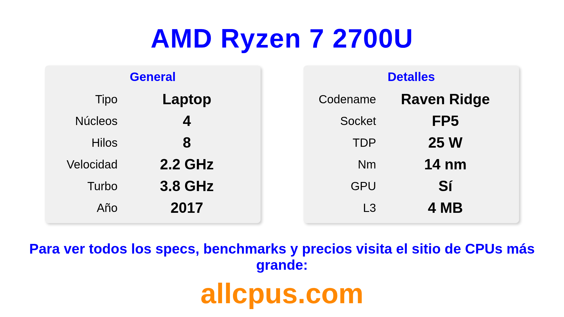El AMD Ryzen 7 2700U es un procesador portátil de AMD de la gama Ryzen, basado en la arquitectura Raven Ridge y lanzado en 2017. Esta CPU cuenta con 4 núcleos, una frecuencia base de 2200 MHz, una frecuencia turbo máxima de 3800 MHz y 4 MB de caché L3. Fabricado usando tecnología de proceso de 14 nm.El AMD Ryzen 7 2700U está diseñado para el socket FP5. Incluye gráficos integrados Radeon RX Vega 10 Graphics.
