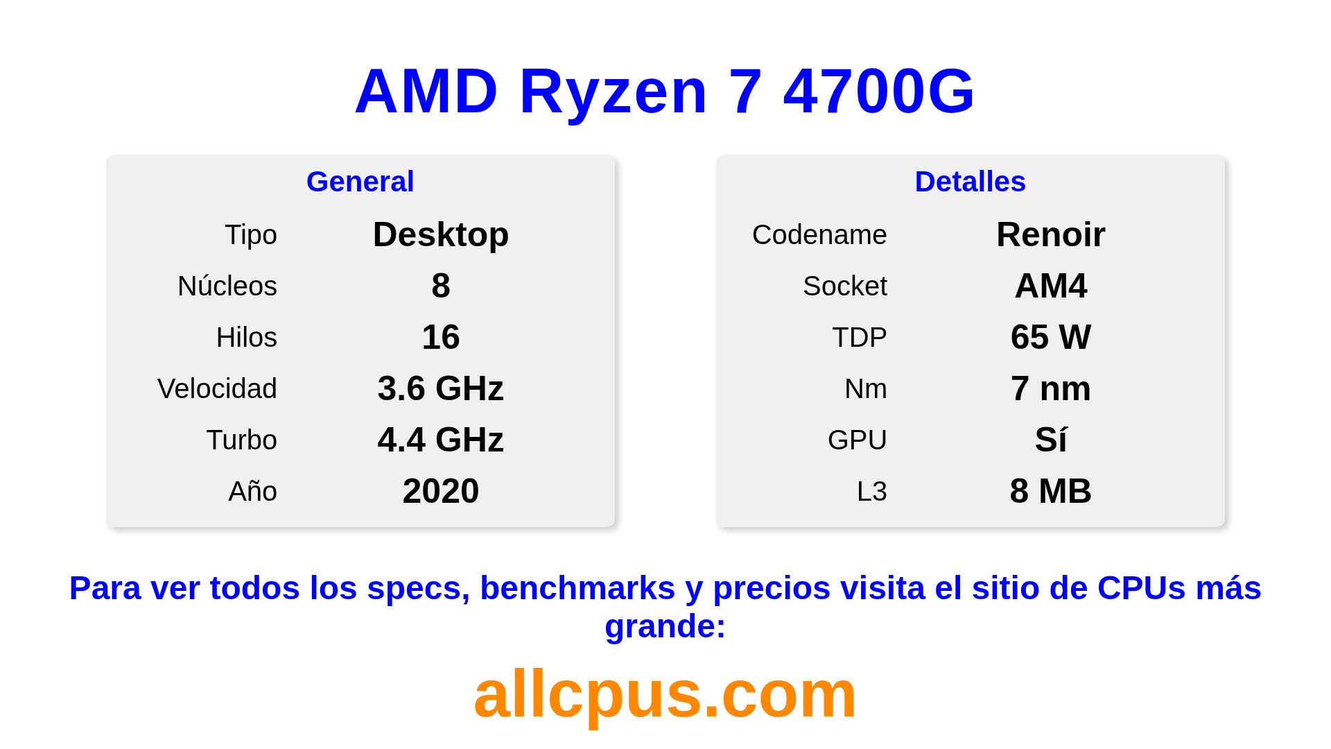 El AMD Ryzen 7 4700G es un procesador de escritorio de AMD de la gama Ryzen, basado en la arquitectura Renoir y lanzado en 2020. Esta CPU cuenta con 8 núcleos, una frecuencia base de 3600 MHz, una frecuencia turbo máxima de 4400 MHz y 8 MB de caché L3. Fabricado usando tecnología de proceso de 7 nm.El AMD Ryzen 7 4700G está diseñado para el socket AM4.Admite overclocking. Incluye gráficos integrados Radeon Graphics.
