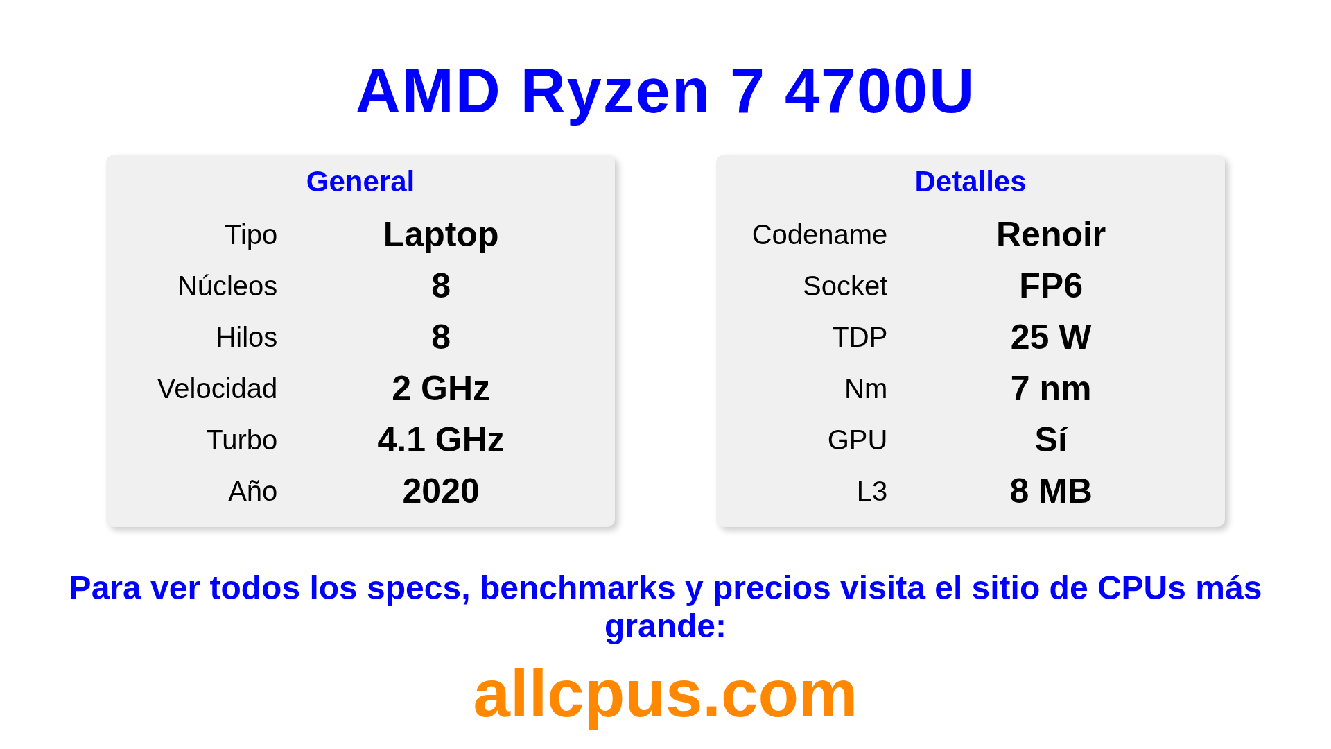 El AMD Ryzen 7 4700U es un procesador portátil de AMD de la gama Ryzen, basado en la arquitectura Renoir y lanzado en 2020. Esta CPU cuenta con 8 núcleos, una frecuencia base de 2000 MHz, una frecuencia turbo máxima de 4100 MHz y 8 MB de caché L3. Fabricado usando tecnología de proceso de 7 nm.El AMD Ryzen 7 4700U está diseñado para el socket FP6.Admite overclocking. Incluye gráficos integrados AMD Radeon Graphics.