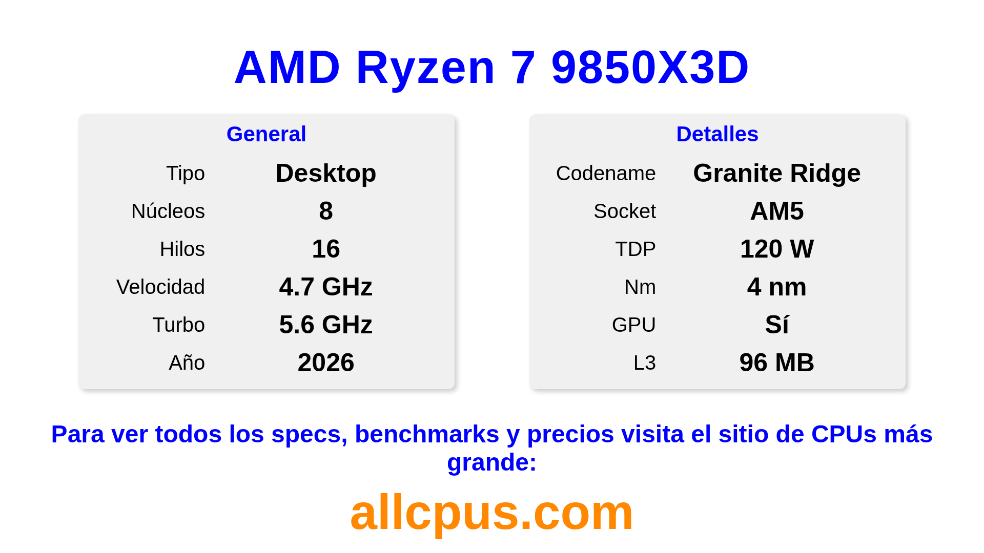 El AMD Ryzen 7 9850X3D es un procesador de escritorio de AMD de la gama Ryzen, basado en la arquitectura Granite Ridge y lanzado en 2026. Esta CPU cuenta con 8 núcleos, una frecuencia base de 4700 MHz, una frecuencia turbo máxima de 5600 MHz y 96 MB de caché L3. Fabricado usando tecnología de proceso de 4 nm.El AMD Ryzen 7 9850X3D está diseñado para el socket AM5.Admite overclocking. Incluye gráficos integrados AMD Radeon Graphics.