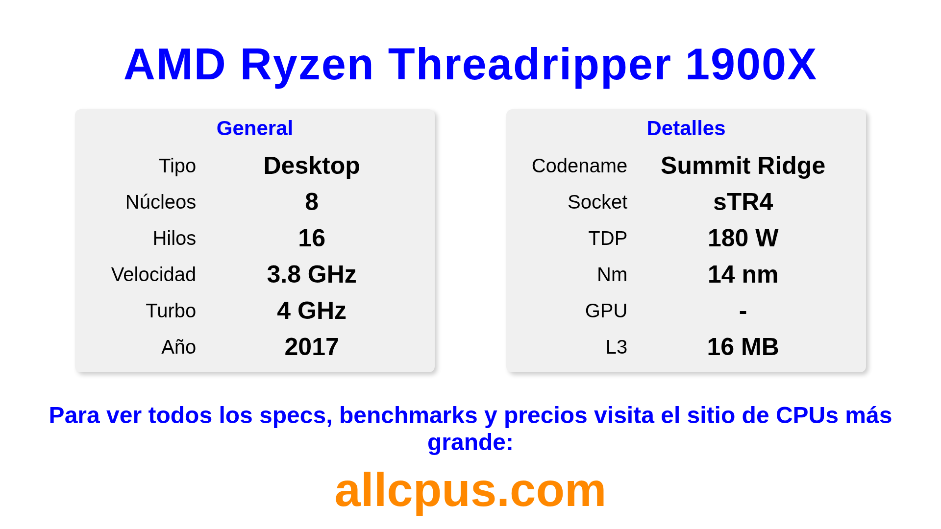 El AMD Ryzen Threadripper 1900X es un procesador de escritorio de AMD de la gama Ryzen Threadripper, basado en la arquitectura Summit Ridge y lanzado en 2017. Esta CPU cuenta con 8 núcleos, una frecuencia base de 3800 MHz, una frecuencia turbo máxima de 4000 MHz y 16 MB de caché L3. Fabricado usando tecnología de proceso de 14 nm.El AMD Ryzen Threadripper 1900X está diseñado para el socket sTR4.Admite overclocking. Se requiere una tarjeta gráfica dedicada.