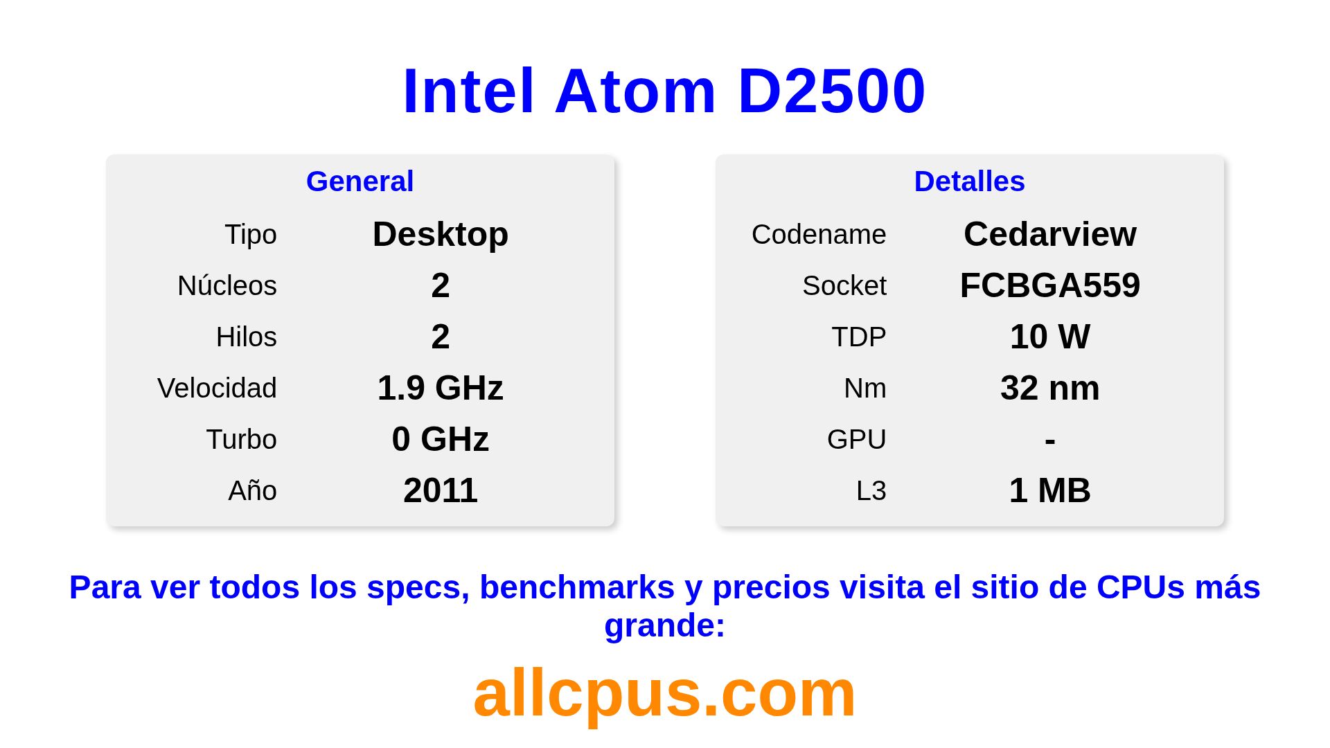 El Intel Atom D2500 es un procesador de escritorio de Intel de la gama Intel Atom Processor Family, basado en la arquitectura Cedarview y lanzado en 2011. Esta CPU cuenta con 2 núcleos, una frecuencia base de 1860 MHz, una frecuencia turbo máxima de 0 MHz y 1 MB de caché L3. Fabricado usando tecnología de proceso de 32 nm.El Intel Atom D2500 está diseñado para el socket BGA559. Se requiere una tarjeta gráfica dedicada.