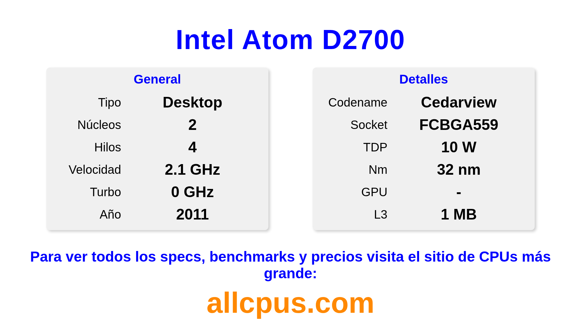 El Intel Atom D2700 es un procesador de escritorio de Intel de la gama Intel Atom Processor Family, basado en la arquitectura Cedarview y lanzado en 2011. Esta CPU cuenta con 2 núcleos, una frecuencia base de 2130 MHz, una frecuencia turbo máxima de 0 MHz y 1 MB de caché L3. Fabricado usando tecnología de proceso de 32 nm.El Intel Atom D2700 está diseñado para el socket BGA559. Se requiere una tarjeta gráfica dedicada.