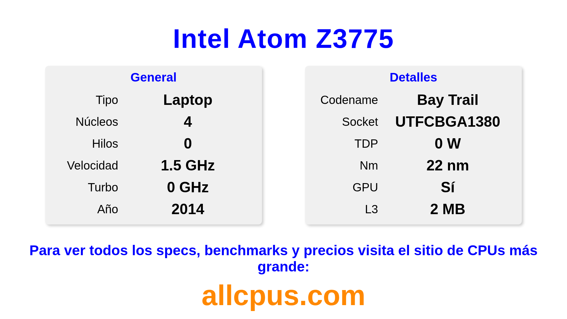 El Intel Atom Z3775 es un procesador portátil de Intel de la gama Intel Atom Processor Family, basado en la arquitectura Bay Trail y lanzado en 2014. Esta CPU cuenta con 4 núcleos, una frecuencia base de 1460 MHz, una frecuencia turbo máxima de 0 MHz y 2 MB de caché L3. Fabricado usando tecnología de proceso de 22 nm.El Intel Atom Z3775 está diseñado para el socket UTFCBGA1380. Incluye gráficos integrados Intel® HD Graphics for Intel Atom® Processor Z3700 Series.