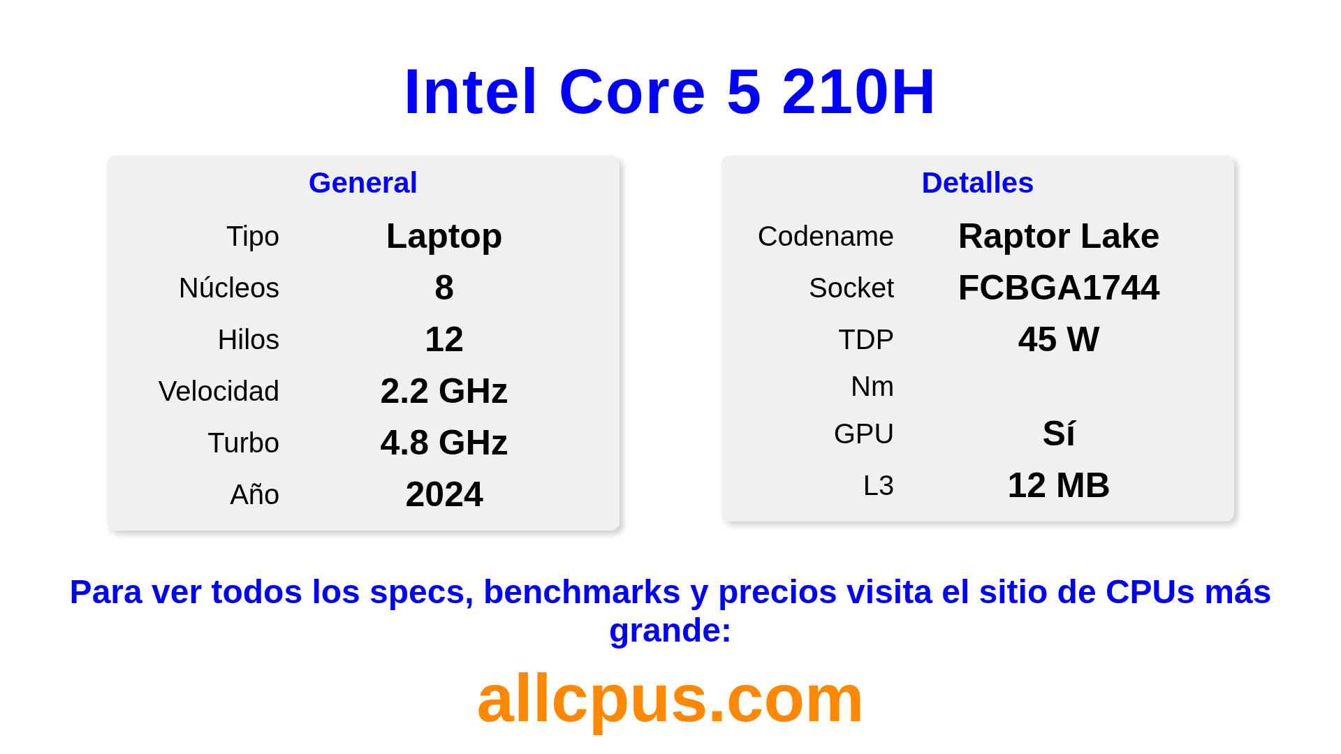 El Intel Core 5 210H es un procesador portátil de Intel de la gama Intel Core, basado en la arquitectura Raptor Lake y lanzado en 2024. Esta CPU cuenta con 8 núcleos, una frecuencia base de 2200 MHz, una frecuencia turbo máxima de 4800 MHz y 12 MB de caché L3. El Intel Core 5 210H está diseñado para el socket BGA1744. Incluye gráficos integrados Intel® Graphics.